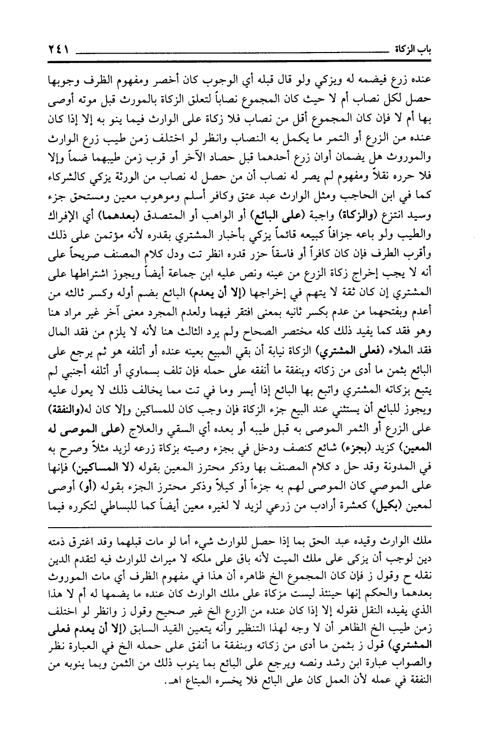 عنده زرع فيضمه له ويزكي ولو قال قبله أي الوجوب كان أخصر ومفهوم الظرف وجوبها حصل لكل نصاب أم لا حيث كان المجموع نصابًا لتعلق الزكاة بالمورث قبل موته أوصى بها أم لا فإن كان المجموع أقل من نصاب فلا زكاة على الوارث فيما ينو به إلا إذا كان عنده من الزرع أو التمر ما يكمل به النصاب وانظر لو اختلف زمن طيب زرع الوارث والموروث هل يضمان أوان زرع أحدهما قبل حصاد الآخر أو قرب زمن طيبهما ضمًّا وإلا فلا حرره نقلًا ومفهوم لم يصر له نصاب أن من حصل له نصاب من الورثة يزكي كالشركاء كما في ابن الحاجب ومثل الوارث عبد عتق وكافر أسلم وموهوب معين ومستحق جزء وسيد انتزع (والزكاة) واجبة (على البائع) أو الواهب أو المتصدق (بعدهما) أي الإفراك والطيب ولو باعه جزافًا كبيعه قائمًا يزكي بأخبار المشتري بقدره لأنه مؤتمن على ذلك وأقرب الطرف فإن كان كافرًا أو فاسقًا حزر قدره انظر تت ودل كلام المصنف صريحًا على أنه لا يجب إخراج زكاة الزرع من عينه ونص عليه ابن جماعة أيضًا ويجوز اشتراطها على المشتري إن كان ثقة لا يتهم في إخراجها (إلا أن يعدم) البائع بضم أوله وكسر ثالثه من أعلم وبفتحهما من عدم بكسر ثانيه بمعنى افتقر فيهما ولعدم المجرد معنى آخر غير مراد هنا وهو فقد كما يفيد ذلك كله مختصر الصحاح ولم يرد الثالث هنا لأنه لا يلزم من فقد المال فقد الملاء (فعلى المشتري) الزكاة نيابة أن بقي المبيع بعينه عنده أو أتلفه هو ثم يرجع على البائع بثمن ما أدى من زكاته وبنفقة ما أنفقه على حمله فإن تلف بسماوي أو أتلفه أجنبي لم يتبع بزكاته المشتري واتبع بها البائع إذا أيسر وما في تت مما يخالف ذلك لا يعول عليه ويجوز للبائع أن يستثني عند البيع جزء الزكاة فإن وجب كان للمساكين وإلا كان له (والنفقة) على الزرع أو الثمر الموصى به قبل طيبه أو بعده أي السقي والعلاج (على الموصى له المعين) كزيد (بجزء) شائع كنصف ودخل في بجزء وصيته بزكاة زرعه لزيد مثلًا وصرح به في المدونة وقد حل د كلام المصنف بها وذكر محترز المعين بقوله (لا المساكين) فإنها على الموصي كان الموصى لهم به جزءًا أو كيلًا وذكر محترز الجزء بقوله (أو) أوصى لمعين (بكيل) كعشرة أرادب من زرعي لزيد لا لغيره معين أيضًا كما للبساطي لتكرره فيما