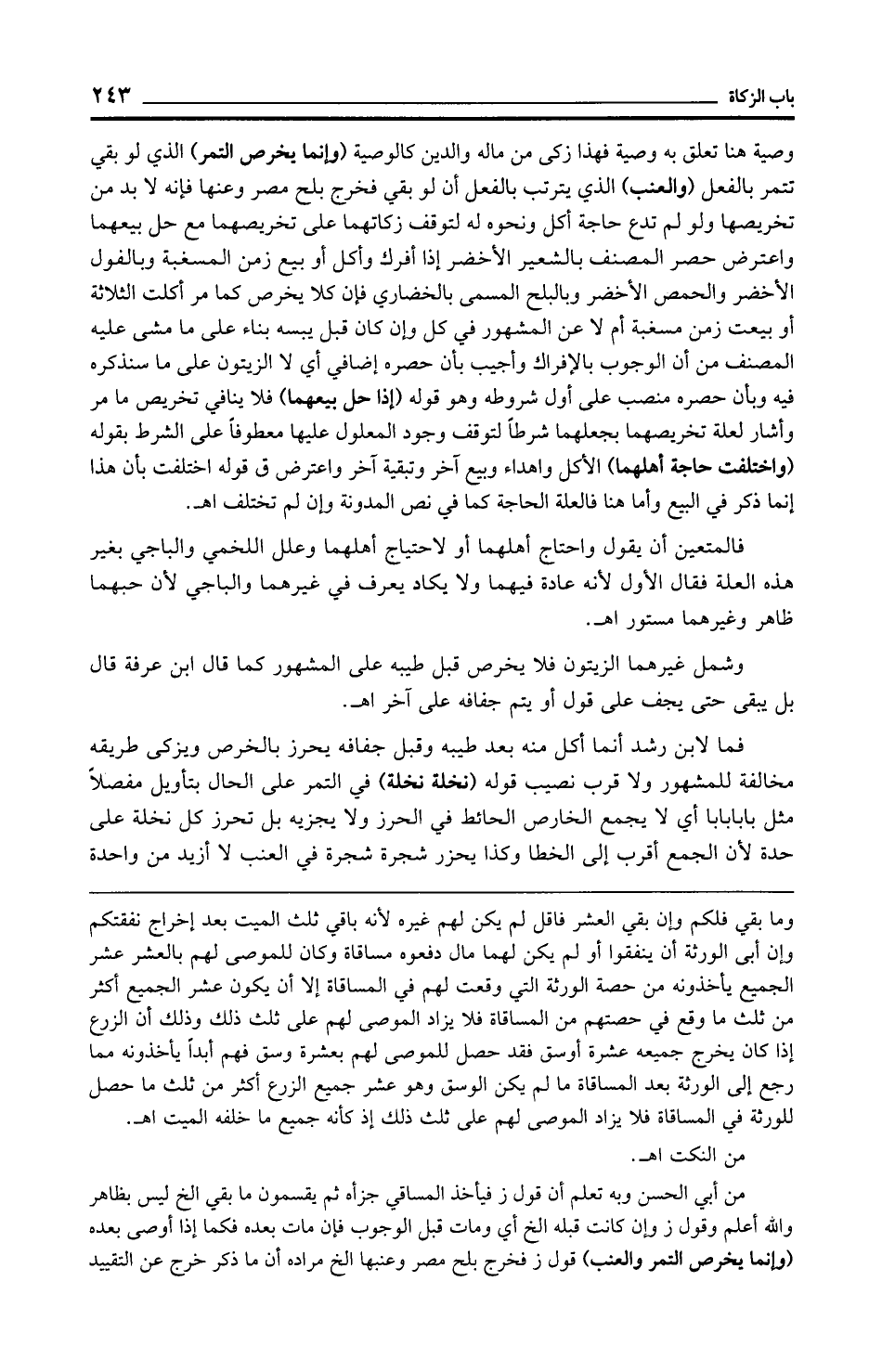 من أبي الحسن وبه تعلم أن قول ز فيأخذ المساقي جزأه ثم يقسمون ما بقي الخ ليس بظاهر والله أعلم وقول ز وإن كانت قبله الخ أي ومات قبل الوجوب فإن مات بعده فكما إذا أوصى بعده (وإنما يخرص التمر والعنب) قول ز فخرج بلح مصر وعنبها الخ مراده أن ما ذكر خرج عن التقييد