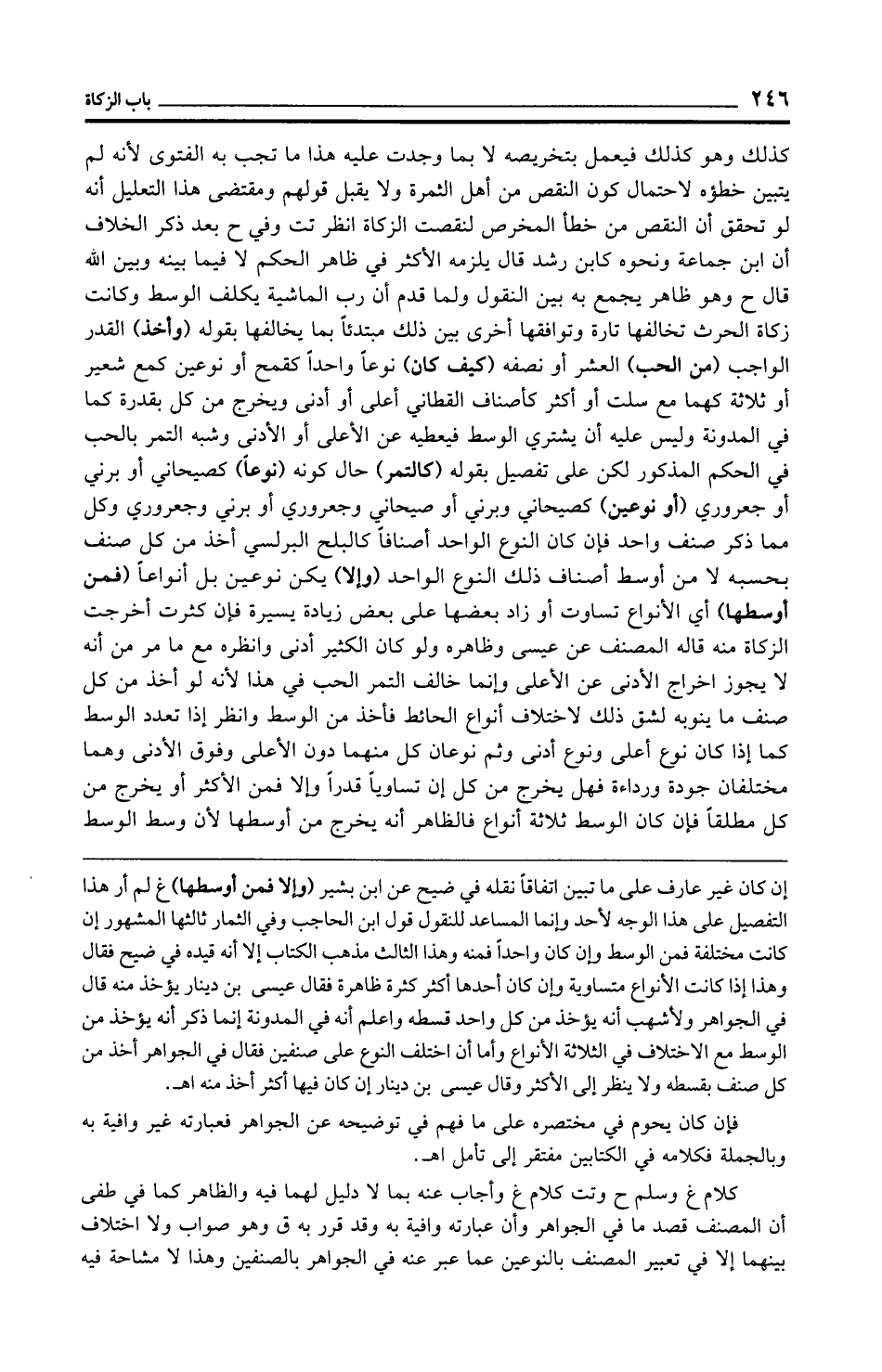 كذلك وهو كذلك فيعمل بتخريصه لا بما وجدت عليه هذا ما تجب به الفتوى لأنه لم يتبين خطؤه لاحتمال كون النقص من أهل الثمرة ولا يقبل قولهم ومقتضى هذا التعليل أنه لو تحقق أن النقص من خطأ المخرص لنقصت الزكاة انظر تت وفي ح بعد ذكر الخلاف أن ابن جماعة ونحوه كابن رشد قال يلزمه الأكثر في ظاهر الحكم لا فيما بينه وبين الله قال ح وهو ظاهر يجمع به بين النقول ولما قدم أن رب الماشية يكلف الوسط وكانت زكاة الحرث تخالفها تارة وتوافقها أخرى بين ذلك مبتدئًا بما يخالفها بقوله (وأخذ) القدر الواجب (من الحب) العشر أو نصفه (كيف كان) نوعًا واحدًا كقمح أو نوعين كمع شعير أو ثلاثة كهما مع سلت أو أكثر كأصناف القطاني أعلى أو أدنى ويخرج من كل بقدرة كما في المدونة وليس عليه أن يشتري الوسط فيعطيه عن الأعلى أو الأدنى وشبه التمر بالحب في الحكم المذكور لكن على تفصيل بقوله (كالتمر) حال كونه (نوعًا) كصيحاني أو برني أو جعروري (أو نوعين) كصيحاني وبرني أو صيحاني وجعروري أو برني وجعروري وكل مما ذكر صنف واحد فإن كان النوع الواحد أصنافًا كالبلح البرلسي أخذ من كل صنف بحسبه لا من أوسط أصناف ذلك النوع الواحد (وإلا) يكن نوعين بل أنواعًا (فمن أوسطها) أي الأنواع تساوت أو زاد بعضها على بعض زيادة يسيرة فإن كثرت أخرجت الزكاة منه قاله المصنف عن عيسى وظاهره ولو كان الكثير أدنى وانظره مع ما مر من أنه لا يجوز إخراج الأدنى عن الأعلى وإنما خالف التمر الحب في هذا لأنه لو أخذ من كل صنف ما ينوبه لشق ذلك لاختلاف أنواع الحائط فأخذ من الوسط وانظر إذا تعدد الوسط كما إذا كان نوع أعلى ونوع أدنى وثم نوعان كل منهما دون الأعلى وفوق الأدنى وهما مختلفان جودة ورداءة فهل يخرج من كل إن تساويًا قدرًا وإلا فمن الأكثر أو يخرج من كل مطلقًا فإن كان الوسط ثلاثة أنواع فالظاهر أنه يخرج من أوسطها لأن وسط الوسط