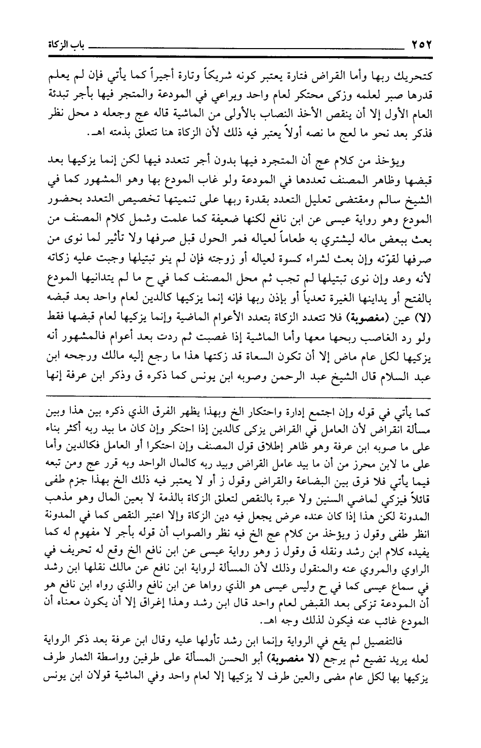 فالتفصيل لم يقع في الرواية وإنما ابن رشد تأولها عليه وقال ابن عرفة بعد ذكر الرواية لعله يريد تضيع ثم يرجع (لا مغصوبة) أبو الحسن المسألة على طرفين وواسطة الثمار طرف يزكيها بها لكل عام مضى والعين طرف لا يزكيها إلا لعام واحد وفي الماشية قولان ابن يونس