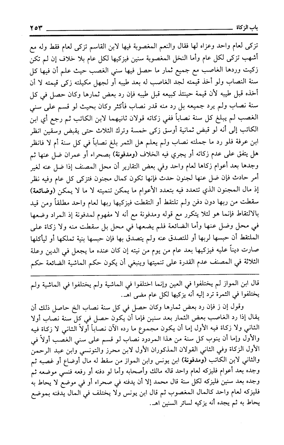 تزكى لعام واحد وعزاه لها فقال والنعم المغصوبة فيها لابن القاسم تزكى لعام فقط وله مع أشهب تزكى لكل عام وأما النخل المغصوبة سنين فيزكيها لكل عام بلا خلاف إن لم تكن زكيت وردها الغاصب مع جميع ثمار ما حصل فيها سني الغصب حيث علم أن فيها كل سنة النصاب ولو أخذ قيمته لجد الغاصب له بعد طيبه أو لجهل مكيلته زكى قيمته لا أن أخذه قبل طيبه لأن قيمة حينئذ كبيعه قبل طيبه فإن رد بعض ثمارها وكان حصل في كل سنة نصاب ولم يرد جميعه بل رد منه قدر نصاب فأكثر وكان بحيث لو قسم على سني الغصب لم يبلغ كل سنة نصابًا ففي زكاته قولان ثانيهما لابن الكاتب ثم رجع أي ابن الكاتب إلى أنه لو قبض ثمانية أوسق زكى خمسة وترك الثلاث حتى يقبض وسقين انظر ابن عرفة فلو رد ما جملته نصاب ولم يعلم هل الثمر بلغ نصابًا في كل سنة أم لا فانظر هل يتفق على عدم زكاته أو يجري فيه الخلاف (ومدفونة) بصحراء أو عمران ضل عنها ثم وجدها بعد أعوام زكاها لعام واحد وفي بعض التقارير أن محل المصنف إذا ضل عنه لغير أمر حادث فإن ضل عنها لجنون حدث فإنها تكون كمال مجنون فتزكى كل عام وفيه نظر إذ مال المجنون الذي تتعدد فيه بتعدد الأعوام ما يمكن تنميته لا ما لا يمكن (وضائعة) سقطت من ربها دون دفن ولم تلتقط أو التقطت فيزكيها ربها لعام واحد مطلقًا ومن قيد بالالتقاط فإنما هو لئلا يتكرر مع قوله ومدفونة مع أنه لا مفهوم لمدفونة إذ المراد وضعها في محل وضل عنها وأما الضائعة فلم يضعها في محل بل سقطت منه ولا زكاة على الملتقط أن حبسها لربها أو للتصدق عنه ولم يتصدق بها فإن حبسها بنية تملكها أو ليأكلها صارت دينًا عليه فيزكيها بعد عام من يوم من نيته إن كان عنده ما يجعل في الدين وعلة الثلاثة في المصنف عدم القدرة على تنميتها وينبغي أن يكون حكم الماشية الضائعة حكم