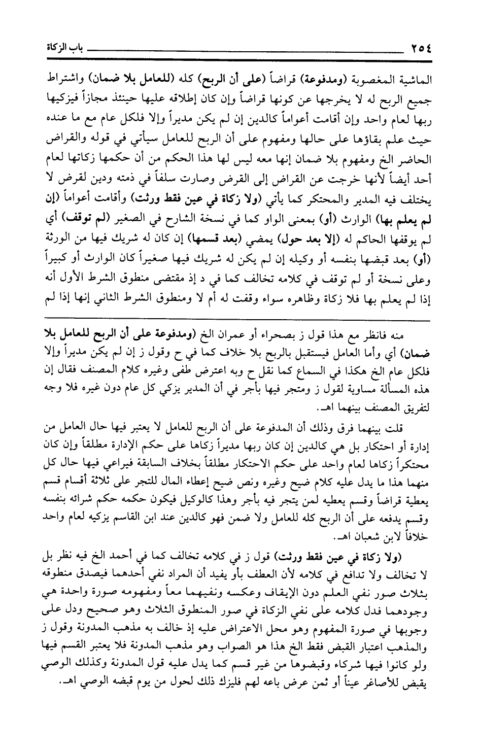 منه فانظر مع هذا قول ز بصحراء أو عمران الخ (ومدفوعة على أن الربح للعامل بلا ضمان) أي وأما العامل فيستقبل بالربح بلا خلاف كما في ح وقول ز إن لم يكن مديرًا وإلا فلكل عام الخ هكذا في السماع كما نقل ح وبه اعترض طفى وغيره كلام المصنف فقال إن هذه المسألة مساوية لقول ز ومتجر فيها بأجر في أن المدير يزكي كل عام دون غيره فلا وجه لتفريق المصنف بينهما اهـ.