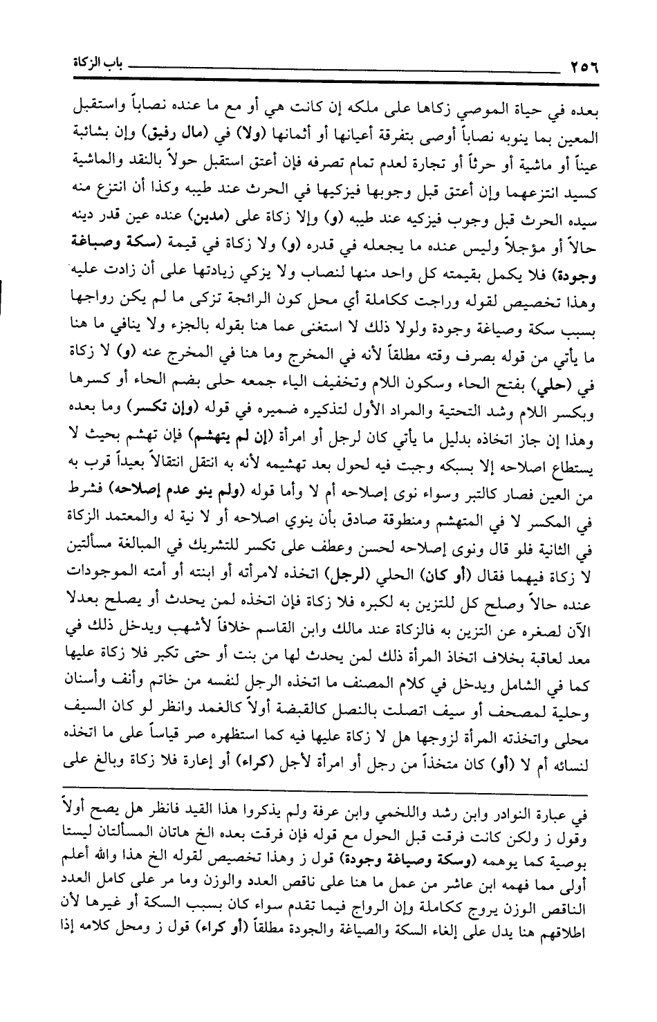 بعده في حياة الموصي زكاها على ملكه إن كانت هي أو مع ما عنده نصابًا واستقبل المعين بما ينوبه نصابًا أوصى بتفرقة أعيانها أو أثمانها (ولا) في (مال رفيق) وإن بشائبة عينًا أو ماشية أو حرثًا أو تجارة لعدم تمام تصرفه فإن أعتق استقبل حولًا بالنقد والماشية كسيد انتزعهما وإن أعتق قبل وجوبها فيزكيها في الحرث عند طيبه وكذا أن انتزع منه سيده الحرث قبل وجوب فيزكيه عند طيبه (و) وإلا زكاة على (مدين) عنده عين قدر دينه حالًا أو مؤجلًا وليس عنده ما يجعله في قدره (و) ولا زكاة في قيمة (سكة وصباغة وجودة) فلا يكمل بقيمته كل واحد منها لنصاب ولا يزكي زيادتها على أن زادت عليه وهذا تخصيص لقوله وراجت ككاملة أي محل كون الرائجة تزكى ما لم يكن رواجها بسبب سكة وصياغة وجودة ولولا ذلك لا استغنى عما هنا بقوله بالجزء ولا ينافي ما هنا ما يأتي من قوله بصرف وقته مطلقًا لأنه في المخرج وما هنا في المخرج عنه (و) لا زكاة في (حلي) بفتح الحاء وسكون اللام وتخفيف الياء جمعه حلى بضم الحاء أو كسرها وبكسر اللام وشد التحتية والمراد الأول لتذكيره ضميره في قوله (وإن تكسر) وما بعده وهذا إن جاز اتخاذه بدليل ما يأتي كان لرجل أو امرأة (إن لم يتهشم) فإن تهشم بحيث لا يستطاع إصلاحه إلا بسبكه وجبت فيه لحول بعد تهشيمه لأنه به انتقل انتقالًا بعيدًا قرب به من العين فصار كالتبر وسواء نوى إصلاحه أم لا وأما قوله (ولم ينو عدم إصلاحه) فشرط في المكسر لا في المتهشم ومنطوقة صادق بأن ينوي إصلاحه أو لا نية له والمعتمد الزكاة في الثانية فلو قال ونوى إصلاحه لحسن وعطف على تكسر للتشريك في المبالغة مسألتين لا زكاة فيهما فقال (أو كان) الحلي (لرجل) اتخذه لامرأته أو ابنته أو أمته الموجودات عنده حالًا وصلح كل للتزين به لكبره فلا زكاة فإن اتخذه لمن يحدث أو يصلح بعدلا الآن لصغره عن التزين به فالزكاة عند مالك وابن القاسم خلافًا لأشهب ويدخل ذلك في معد لعاقبة بخلاف اتخاذ المرأة ذلك لمن يحدث لها من بنت أو حتى تكبر فلا زكاة عليها كما في الشامل ويدخل في كلام المصنف ما اتخذه الرجل لنفسه من خاتم وأنف وأسنان وحلية لمصحف أو سيف اتصلت بالنصل كالقبضة أولًا كالغمد وانظر لو كان السيف محلى واتخذته المرأة لزوجها هل لا زكاة عليها فيه كما استظهره صر قياسًا على ما اتخذه لنسائه أم لا (أو) كان متخذًا من رجل أو امرأة لأجل (كراء) أو إعارة فلا زكاة وبالغ على