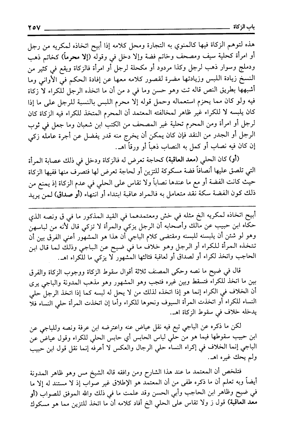 لكن ما ذكره عن الباجي تبع فيه نقل عياض عنه واعترضه ابن عرفة ونصه وللباجي عن ابن حبيب سقوطها فيما هو من حلي لباس الحابس أي حابس الحلي للكراء وقول عياض عن الباجي إنما الخلاف في إكراء النساء حلي الرجال والعكس لا أعرفه إنما نقل قول ابن حبيب ولم يحك غيره اهـ.