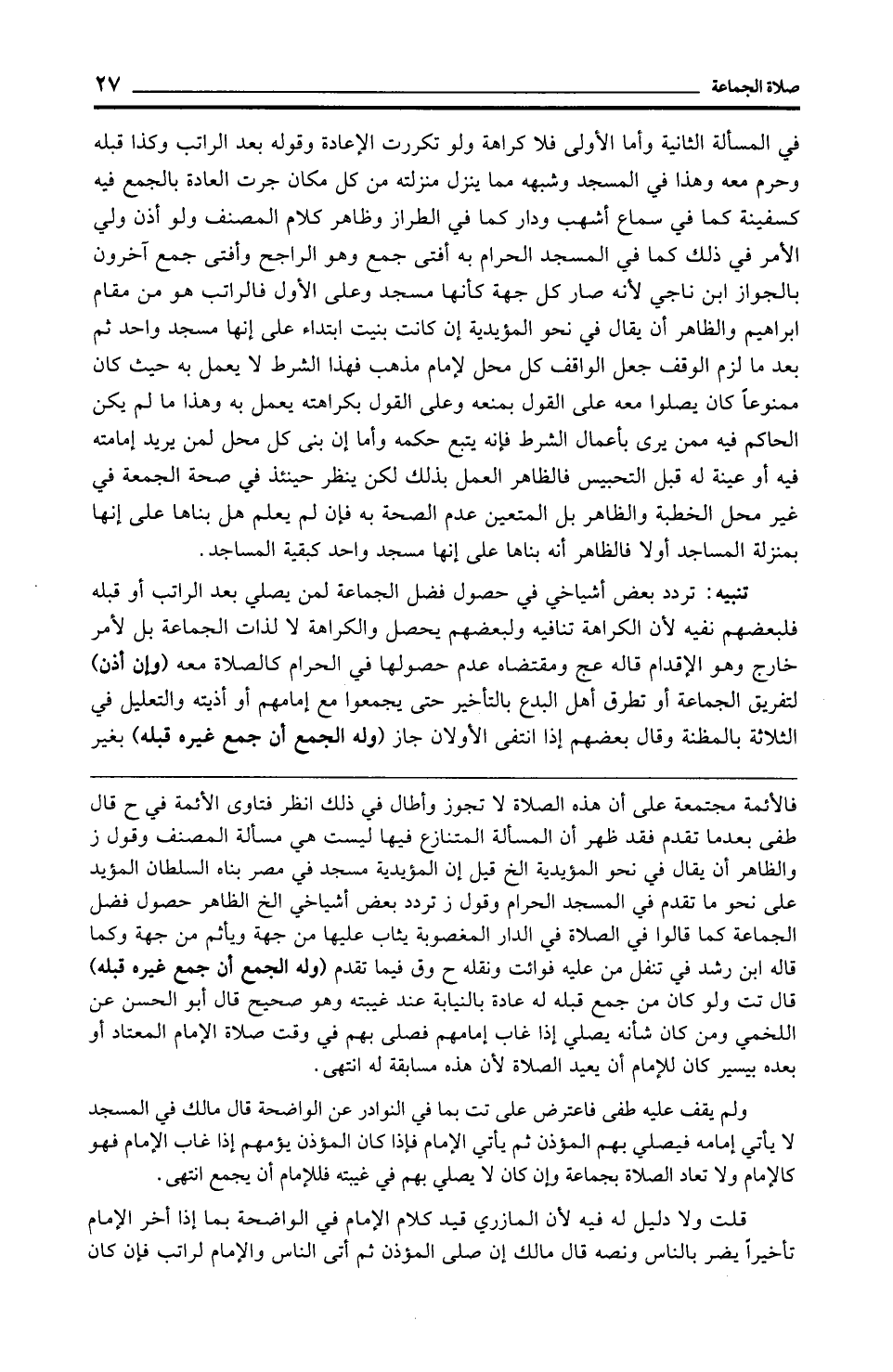 في المسألة الثانية وأما الأولى فلا كراهة ولو تكررت الإعادة وقوله بعد الراتب وكذا قبله وحرم معه وهذا في المسجد وشبهه مما ينزل منزلته من كل مكان جرت العادة بالجمع فيه كسفينة كما في سماع أشهب ودار كما في الطراز وظاهر كلام المصنف ولو أذن ولي الأمر في ذلك كما في المسجد الحرام به أفتى جمع وهو الراجح وأفتى جمع آخرون بالجواز ابن ناجي لأنه صار كل جهة كأنها مسجد وعلى الأول فالراتب هو من مقام إبراهيم والظاهر أن يقال في نحو المؤيدية إن كانت بنيت ابتداء على إنها مسجد واحد ثم بعد ما لزم الوقف جعل الواقف كل محل لإمام مذهب فهذا الشرط لا يعمل به حيث كان ممنوعًا كان يصلوا معه على القول بمنعه وعلى القول بكراهته يعمل به وهذا ما لم يكن الحاكم فيه ممن يرى بأعمال الشرط فإنه يتبع حكمه وأما إن بنى كل محل لمن يريد إمامته فيه أو عينة له قبل التحبيس فالظاهر العمل بذلك لكن ينظر حينئذ في صحة الجمعة في غير محل الخطبة والظاهر بل المتعين عدم الصحة به فإن لم يعلم هل بناها على إنها بمنزلة المساجد أولًا فالظاهر أنه بناها على إنها مسجد واحد كبقية المساجد.