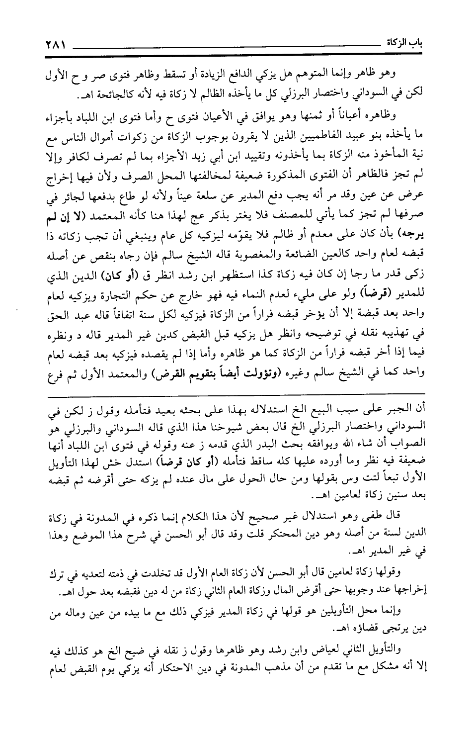 أن الجبر على سبب البيع الخ استدلاله بهذا على بحثه بعيد فتأمله وقول ز لكن في السوداني واختصار البرزلي الخ قال بعض شيوخنا هذا الذي قاله السوداني والبرزلي هو الصواب إن شاء الله ويوافقه بحث البدر الذي قدمه ز عنه وقوله في فتوى ابن اللباد أنها ضعيفة فيه نظر وما أورده عليها كله ساقط فتأمله (أو كان قرضًا) استدل خش لهذا التأويل الأول تبعًا لتت وس بقولها ومن حال الحول على مال عنده لم يزكه حتى أقرضه ثم قبضه بعد سنين زكاة لعامين اهـ.
