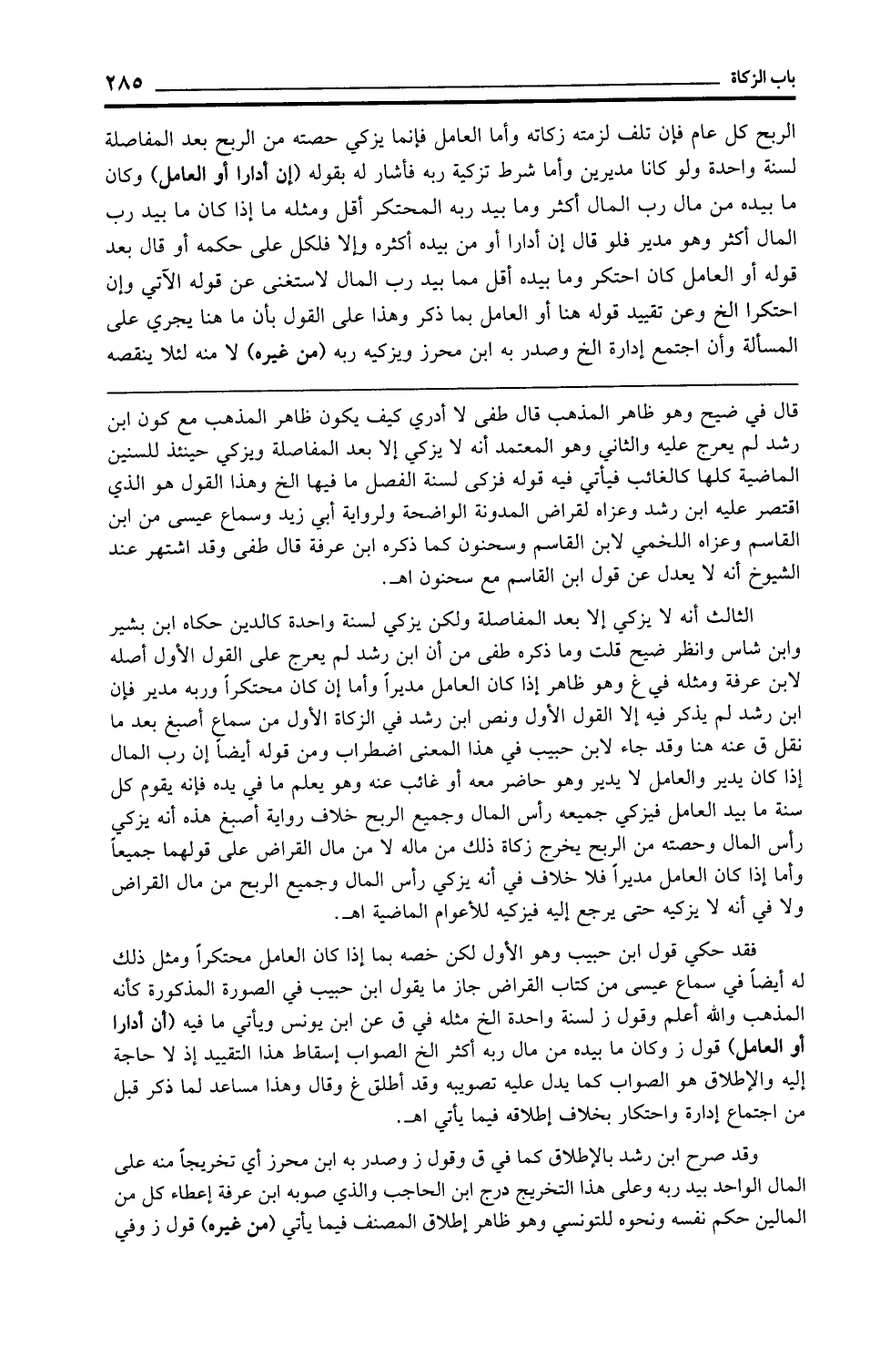 الثالث أنه لا يزكي إلا بعد المفاصلة ولكن يزكي لسنة واحدة كالدين حكاه ابن بشير وابن شاس وانظر ضيح قلت وما ذكره طفى من أن ابن رشد لم يعرج على القول الأول أصله لابن عرفة ومثله في غ وهو ظاهر إذا كان العامل مديرًا وأما إن كان محتكرًا وربه مدير فإن ابن رشد لم يذكر فيه إلا القول الأول ونص ابن رشد في الزكاة الأول من سماع أصبغ بعد ما نقل ق عنه هنا وقد جاء لابن حبيب في هذا المعنى اضطراب ومن قوله أيضًا إن رب المال إذا كان يدير والعامل لا يدير وهو حاضر معه أو غائب عنه وهو يعلم ما في يده فإنه يقوم كل سنة ما بيد العامل فيزكي جميعه رأس المال وجميع الربح خلاف رواية أصبغ هذه أنه يزكي رأس المال وحصته من الربح يخرج زكاة ذلك من ماله لا من مال القراض على قولهما جميعًا وأما إذا كان العامل مديرًا فلا خلاف في أنه يزكي رأس المال وجميع الربح من مال القراض ولا في أنه لا يزكيه حتى يرجع إليه فيزكيه للأعوام الماضية اهـ.