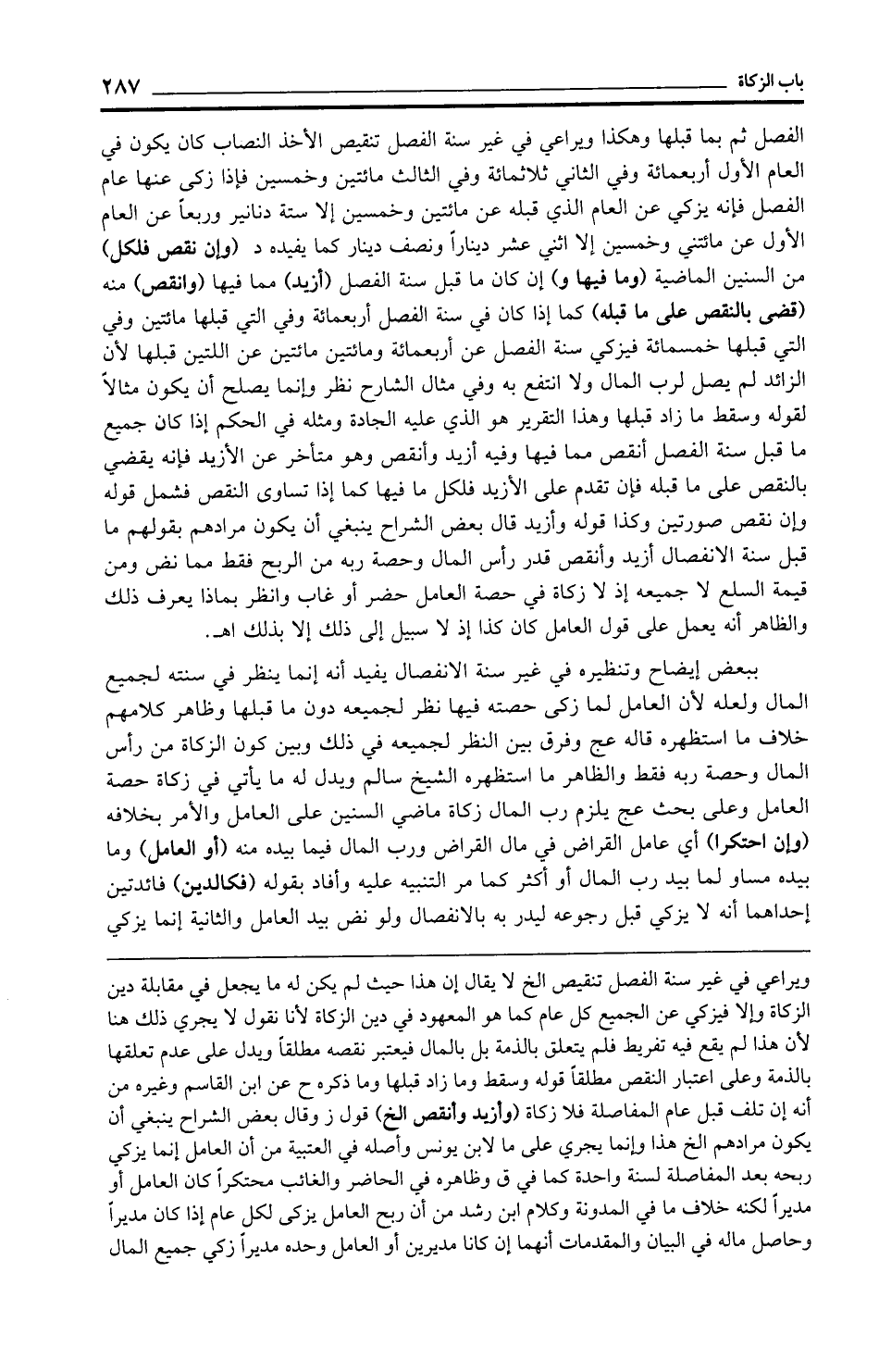 ويراعي في غير سنة الفصل تنقيص الخ لا يقال إن هذا حيث لم يكن له ما يجعل في مقابلة دين الزكاة وإلا فيزكي عن الجميع كل عام كما هو المعهود في دين الزكاة لأنا نقول لا يجري ذلك هنا لأن هذا لم يقع فيه تفريط فلم يتعلق بالذمة بل بالمال فيعتبر نقصه مطلقًا ويدل على عدم تعلقها بالذمة وعلى اعتبار النقص مطلقًا قوله وسقط وما زاد قبلها وما ذكره ح عن ابن القاسم وغيره من أنه إن تلف قبل عام المفاصلة فلا زكاة (وأزيد وأنقص الخ) قول ز وقال بعض الشراح ينبغي أن يكون مرادهم الخ هذا وإنما يجري على ما لابن يونس وأصله في العتبية من أن العامل إنما يزكي ربحه بعد المفاصلة لسنة واحدة كما في ق وظاهره في الحاضر والغائب محتكرًا كان العامل أو مديرًا لكنه خلاف ما في المدونة وكلام ابن رشد من أن ربح العامل يزكى لكل عام إذا كان مديرًا وحاصل ماله في البيان والمقدمات أنهما إن كانا مديرين أو العامل وحده مديرًا زكي جميع المال