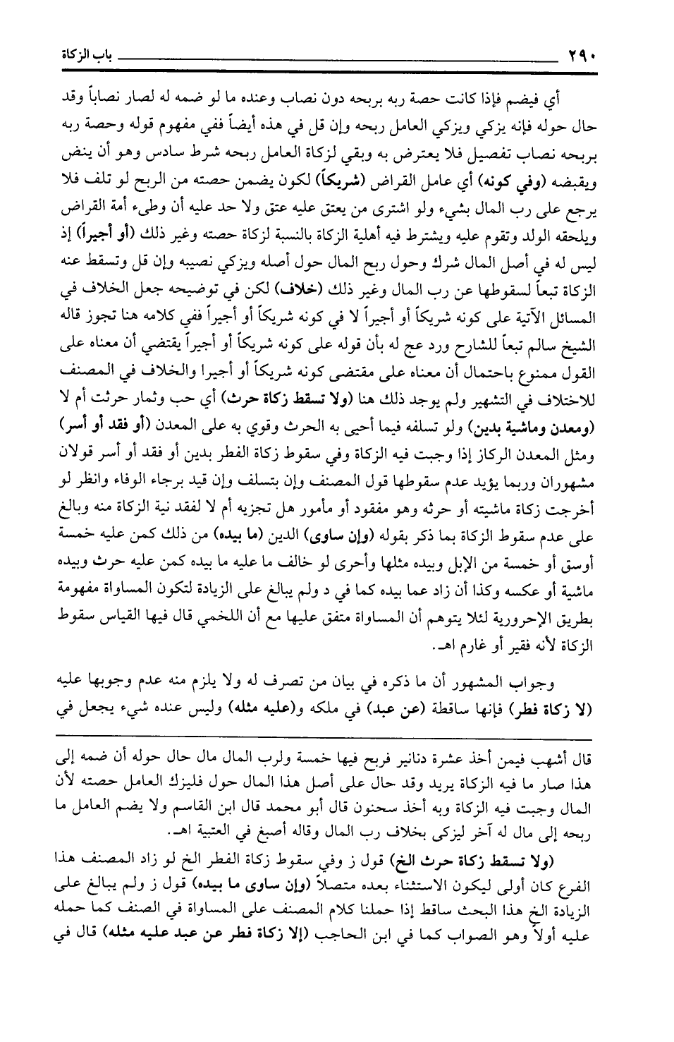 أي فيضم فإذا كانت حصة ربه بربحه دون نصاب وعنده ما لو ضمه له لصار نصابًا وقد حال حوله فإنه يزكي ويزكي العامل ربحه وإن قل في هذه أيضًا ففي مفهوم قوله وحصة ربه بربحه نصاب تفصيل فلا يعترض به وبقي لزكاة العامل ربحه شرط سادس وهو أن ينض ويقبضه (وفي كونه) أي عامل القراض (شريكًا) لكون يضمن حصته من الربح لو تلف فلا يرجع على رب المال بشيء ولو اشترى من يعتق عليه عتق ولا حد عليه أن وطئ أمة القراض ويلحقه الولد وتقوم عليه ويشترط فيه أهلية الزكاة بالنسبة لزكاة حصته وغير ذلك (أو أجيرًا) إذ ليس له في أصل المال شرك وحول ربح المال حول أصله ويزكي نصيبه وإن قل وتسقط عنه الزكاة تبعًا لسقوطها عن رب المال وغير ذلك (خلاف) لكن في توضيحه جعل الخلاف في المسائل الآتية على كونه شريكًا أو أجيرًا لا في كونه شريكًا أو أجيرًا ففي كلامه هنا تجوز قاله الشيخ سالم تبعًا للشارح ورد عج له بأن قوله على كونه شريكًا أو أجيرًا يقتضي أن معناه على القول ممنوع باحتمال أن معناه على مقتضى كونه شريكًا أو أجيرا والخلاف في المصنف للاختلاف في التشهير ولم يوجد ذلك هنا (ولا تسقط زكاة حرث) أي حب وثمار حرثت أم لا (ومعدن وماشية بدين) ولو تسلفه فيما أحيى به الحرث وقوي به على المعدن (أو فقد أو أسر) ومثل المعدن الركاز إذا وجبت فيه الزكاة وفي سقوط زكاة الفطر بدين أو فقد أو أسر قولان مشهوران وربما يؤيد عدم سقوطها قول المصنف وإن بتسلف وإن قيد برجاء الوفاء وانظر لو أخرجت زكاة ماشيته أو حرثه وهو مفقود أو مأمور هل تجزيه أم لا لفقد نية الزكاة منه وبالغ على عدم سقوط الزكاة بما ذكر بقوله (وإن ساوى) الدين (ما بيده) من ذلك كمن عليه خمسة أوسق أو خمسة من الإبل وبيده مثلها وأحرى لو خالف ما عليه ما بيده كمن عليه حرث وبيده ماشية أو عكسه وكذا أن زاد عما بيده كما في د ولم يبالغ على الزيادة لتكون المساواة مفهومة بطريق الإحرورية لئلا يتوهم أن المساواة متفق عليها مع أن اللخمي قال فيها القياس سقوط الزكاة لأنه فقير أو غارم اهـ.