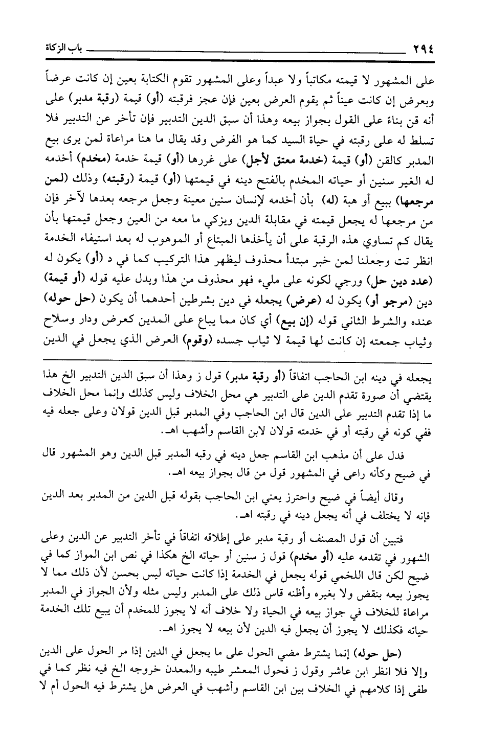على المشهور لا قيمته مكاتبًا ولا عبدًا وعلى المشهور تقوم الكتابة بعين إن كانت عرضًا وبعرض إن كانت عينًا ثم يقوم العرض بعين فإن عجز فرقبته (أو) قيمة (رقبة مدبر) على أنه قن بناءً على القول بجواز بيعه وهذا أن سبق الدين التدبير فإن تأخر عن التدبير فلا تسلط له على رقبته في حياة السيد كما هو الفرض وقد يقال ما هنا مراعاة لمن يرى بيع المدبر كالقن (أو) قيمة (خدمة معتق لأجل) على غررها (أو) قيمة خدمة (مخدم) أخدمه له الغير سنين أو حياته المخدم بالفتح دينه في قيمتها (أو) قيمة (رقبته) وذلك (لمن مرجعها) ببيع أو هبة (له) بأن أخدمه لإنسان سنين معينة وجعل مرجعه بعدها لآخر فإن من مرجعها له يجعل قيمته في مقابلة الدين ويزكي ما معه من العين وجعل قيمتها بأن يقال كم تساوي هذه الرقبة على أن يأخذها المبتاع أو الموهوب له بعد استيفاء الخدمة انظر تت وجعلنا لمن خبر مبتدأ محذوف ليظهر هذا التركيب كما في د (أو) يكون له (عدد دين حل) ورجي لكونه على مليء فهو محذوف من هذا ويدل عليه قوله (أو قيمة) دين (مرجو أو) يكون له (عرض) يجعله في دين بشرطين أحدهما أن يكون (حل حوله) عنده والشرط الثاني قوله (إن بيع) أي كان مما يباع على المدين كعرض ودار وسلاح وثياب جمعته إن كانت لها قيمة لا ثياب جسده (وقوم) العرض الذي يجعل في الدين