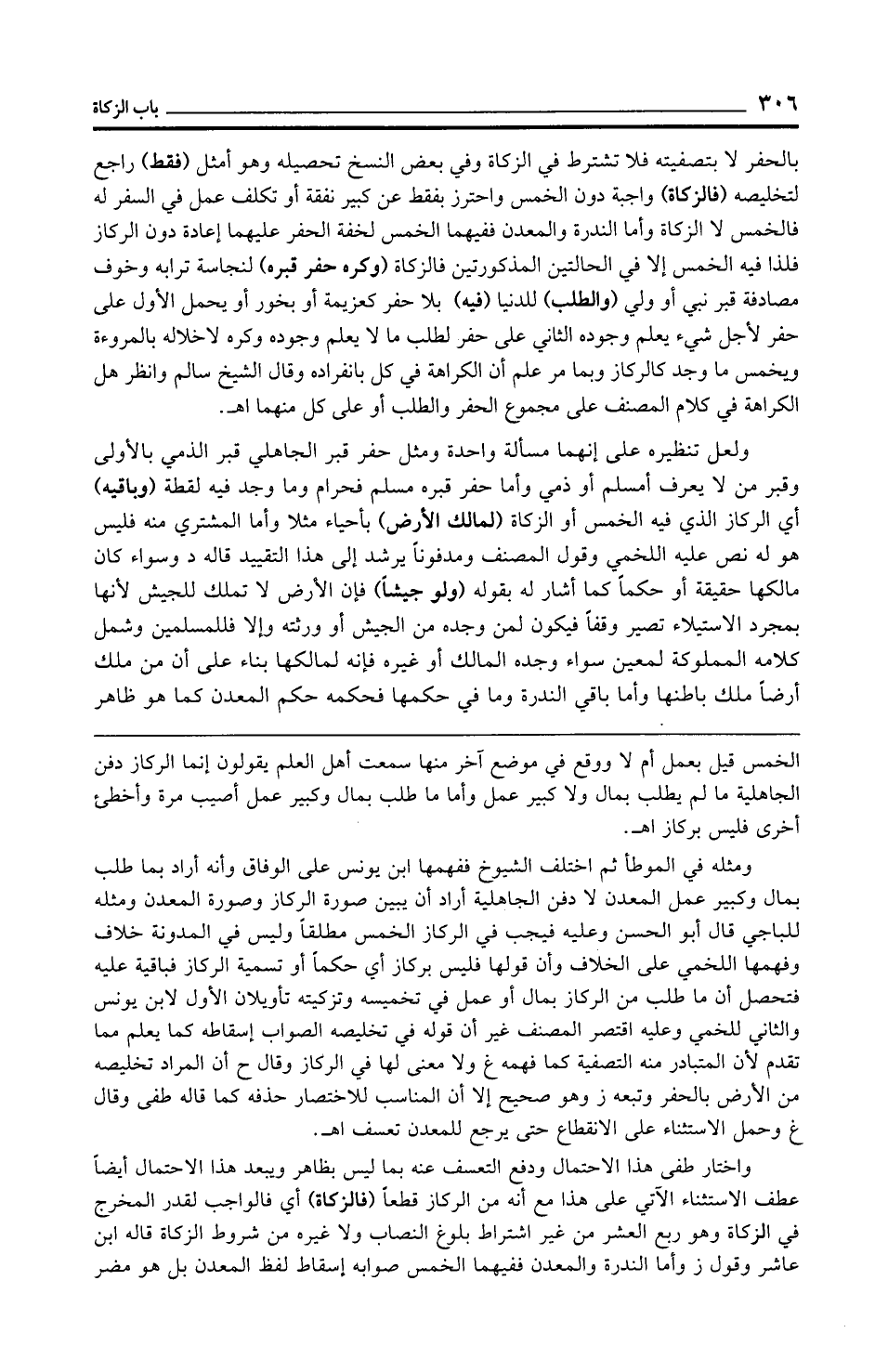 بالحفر لا بتصفيته فلا تشترط في الزكاة وفي بعض النسخ تحصيله وهو أمثل (فقط) راجع لتخليصه (فالزكاة) واجبة دون الخمس واحترز بفقط عن كبير نفقة أو تكلف عمل في السفر له فالخمس لا الزكاة وأما الندرة والمعدن ففيهما الخمس لخفة الحفر عليهما إعادة دون الركاز فلذا فيه الخمس إلا في الحالتين المذكورتين فالزكاة (وكره حفر قبره) لنجاسة ترابه وخوف مصادفة قبر نبي أو ولي (والطلب) للدنيا (فيه) بلا حفر كعزيمة أو بخور أو يحمل الأول على حفر لأجل شيء يعلم وجوده الثاني على حفر لطلب ما لا يعلم وجوده وكره لإخلاله بالمروءة ويخمس ما وجد كالركاز وبما مر علم أن الكراهة في كل بانفراده وقال الشيخ سالم وانظر هل الكراهة في كلام المصنف على مجموع الحفر والطلب أو على كل منهما اهـ.
