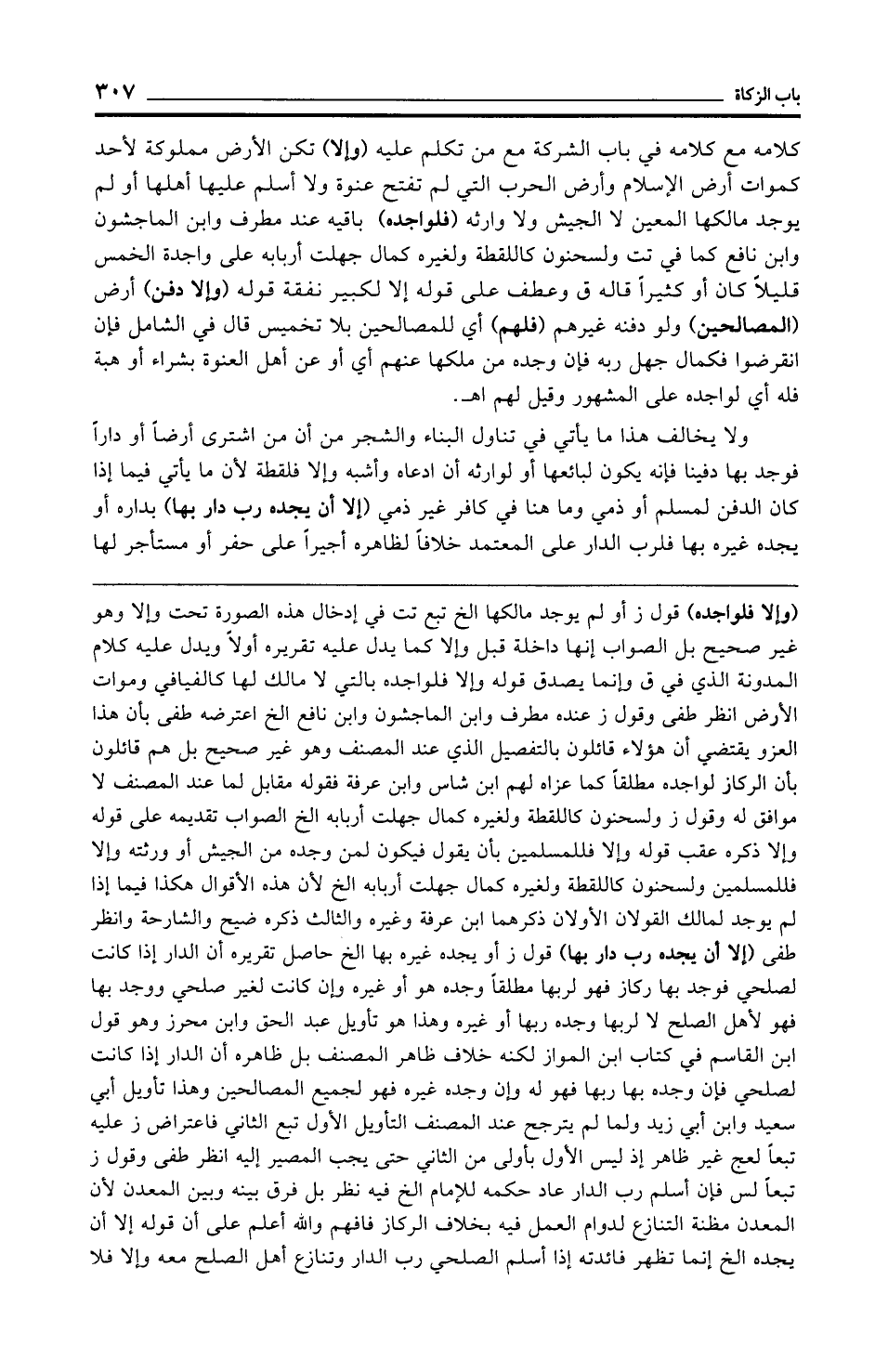 كلامه مع كلامه في باب الشركة مع من تكلم عليه (وإلا) تكن الأرض مملوكة لأحد كموات أرض الإِسلام وأرض الحرب التي لم تفتح عنوة ولا أسلم عليها أهلها أو لم يوجد مالكها المعين لا الجيش ولا وارثه (فلواجده) باقيه عند مطرف وابن الماجشون وابن نافع كما في تت ولسحنون كاللقطة ولغيره كمال جهلت أربابه على واجدة الخمس قليلًا كان أو كثيرًا قاله ق وعطف على قوله إلا لكبير نفقة قوله (وإلا دفن) أرض (المصالحين) ولو دفنه غيرهم (فلهم) أي للمصالحين بلا تخميس قال في الشامل فإن انقرضوا فكمال جهل ربه فإن وجده من ملكها عنهم أي أو عن أهل العنوة بشراء أو هبة فله أي لواجده على المشهور وقيل لهم اهـ.