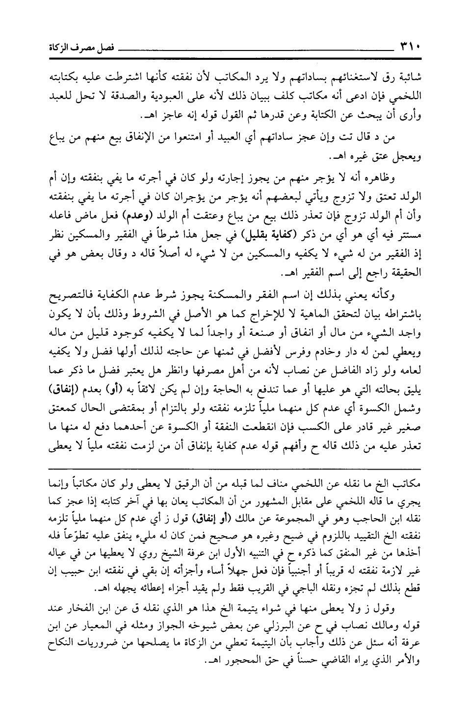 شائبة رق لاستغنائهم بساداتهم ولا يرد المكاتب لأن نفقته كأنها اشترطت عليه بكتابته اللخمي فإن ادعى أنه مكاتب كلف ببيان ذلك لأنه على العبودية والصدقة لا تحل للعبد وأرى أن يبحث عن الكتابة وعن قدرها ثم القول قوله إنه عاجز اهـ.