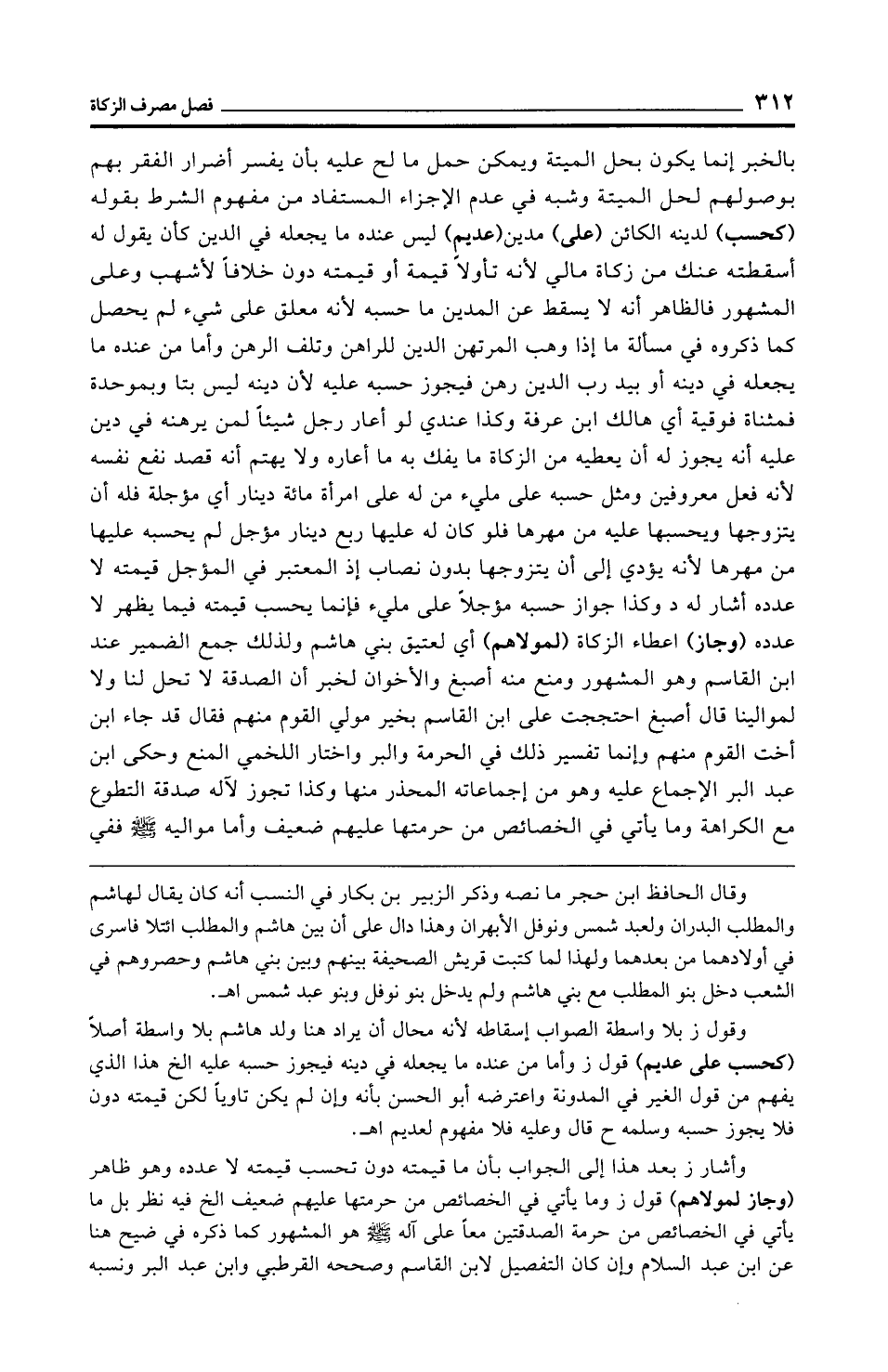 وقول ز بلا واسطة الصواب إسقاطه لأنه محال أن يراد هنا ولد هاشم بلا واسطة أصلًا (كحسب على عديم) قول ز وأما من عنده ما يجعله في دينه فيجوز حسبه عليه الخ هذا الذي يفهم من قول الغير في المدونة واعترضه أبو الحسن بأنه وإن لم يكن تاويًا لكن قيمته دون فلا يجوز حسبه وسلمه ح قال وعليه فلا مفهوم لعديم اهـ.
