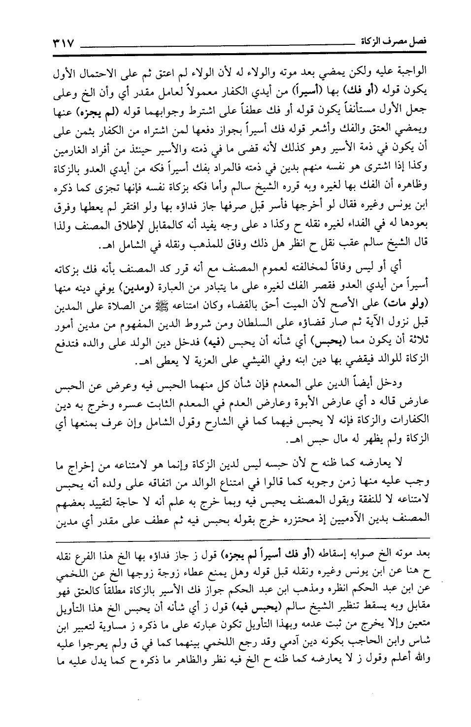 بعد موته الخ صوابه إسقاطه (أو فك أسيرًا لم يجزه) قول ز جاز فداؤه بها الخ هذا الفرع نقله ح هنا عن ابن يونس وغيره ونقله قبل قوله وهل يمنع عطاء زوجة زوجها الخ عن اللخمي عن ابن عبد الحكم انظره ومذهب ابن عبد الحكم جواز فك الأسير بالزكاة مطلقًا كالعتق فهو مقابل وبه يسقط تنظير الشيخ سالم (يحبس فيه) قول ز أي شأنه أن يحبس الخ هذا التأويل متعين وإلا يخرج من ثبت عدمه وبهذا التأويل تكون عبارته على ما ذكره ز مساوية لتعبير ابن شاس وابن الحاجب بكونه دين آدمي وقد رجع اللخمي بينهما كما في ق ولم يعرجوا عليه والله أعلم وقول ز لا يعارضه كما ظنه ح الخ فيه نظر والظاهر ما ذكره ح كما يدل عليه ما