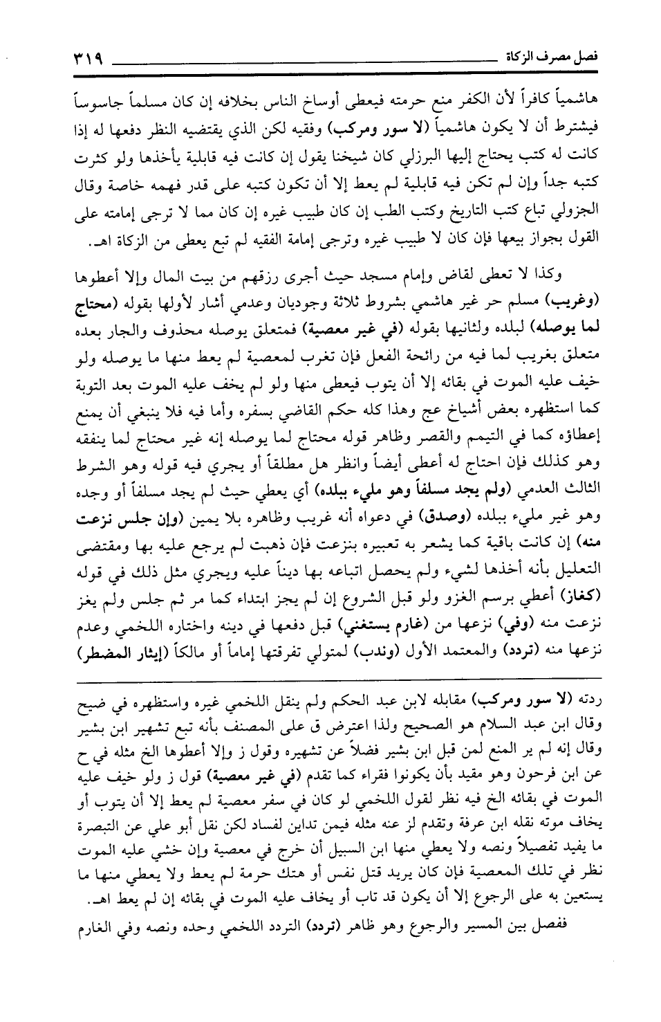 هاشميًّا كافرًا لأن الكفر منع حرمته فيعطى أوساخ الناس بخلافه إن كان مسلمًا جاسوسًا فيشترط أن لا يكون هاشميًّا (لا سور ومركب) وفقيه لكن الذي يقتضيه النظر دفعها له إذا كانت له كتب يحتاج إليها البرزلي كان شيخنا يقول إن كانت فيه قابلية يأخذها ولو كثرت كتبه جدًّا وإن لم تكن فيه قابلية لم يعط إلا أن تكون كتبه على قدر فهمه خاصة وقال الجزولي تباع كتب التاريخ وكتب الطب إن كان طبيب غيره إن كان مما لا ترجى إمامته على القول بجواز بيعها فإن كان لا طبيب غيره وترجى إمامة الفقيه لم تبع يعطى من الزكاة اهـ.