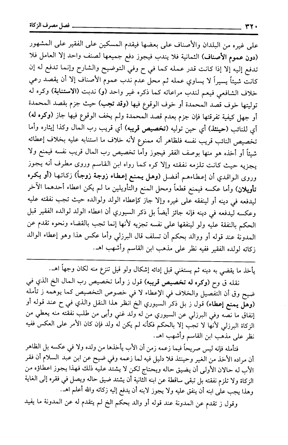 نقله ق وح (وكره له تخصيص قريبه) قول ز وأما تخصيص رب المال الخ الذي في ضيح وق أن التفصيل والخلاف في الإعطاء لا في خصوص التخصيص كما يوهمه ز تأمله (وهل يمنع إعطاء) قول ز بل ذكر السيوري الخ انظر هذا النقل والذي في ح عند قوله أو إنفاق ما نصه وفي البرزلي عن السيوري من له ولد غني وأبى من طلب نفقته منه يعطي من الزكاة البرزلي لأنها لا تجب إلا بالحكم فكأنه لم يكن له ولد فإن كان الأمر على العكس ففيه نظر على مذهب ابن القاسم وأشهب اهـ.