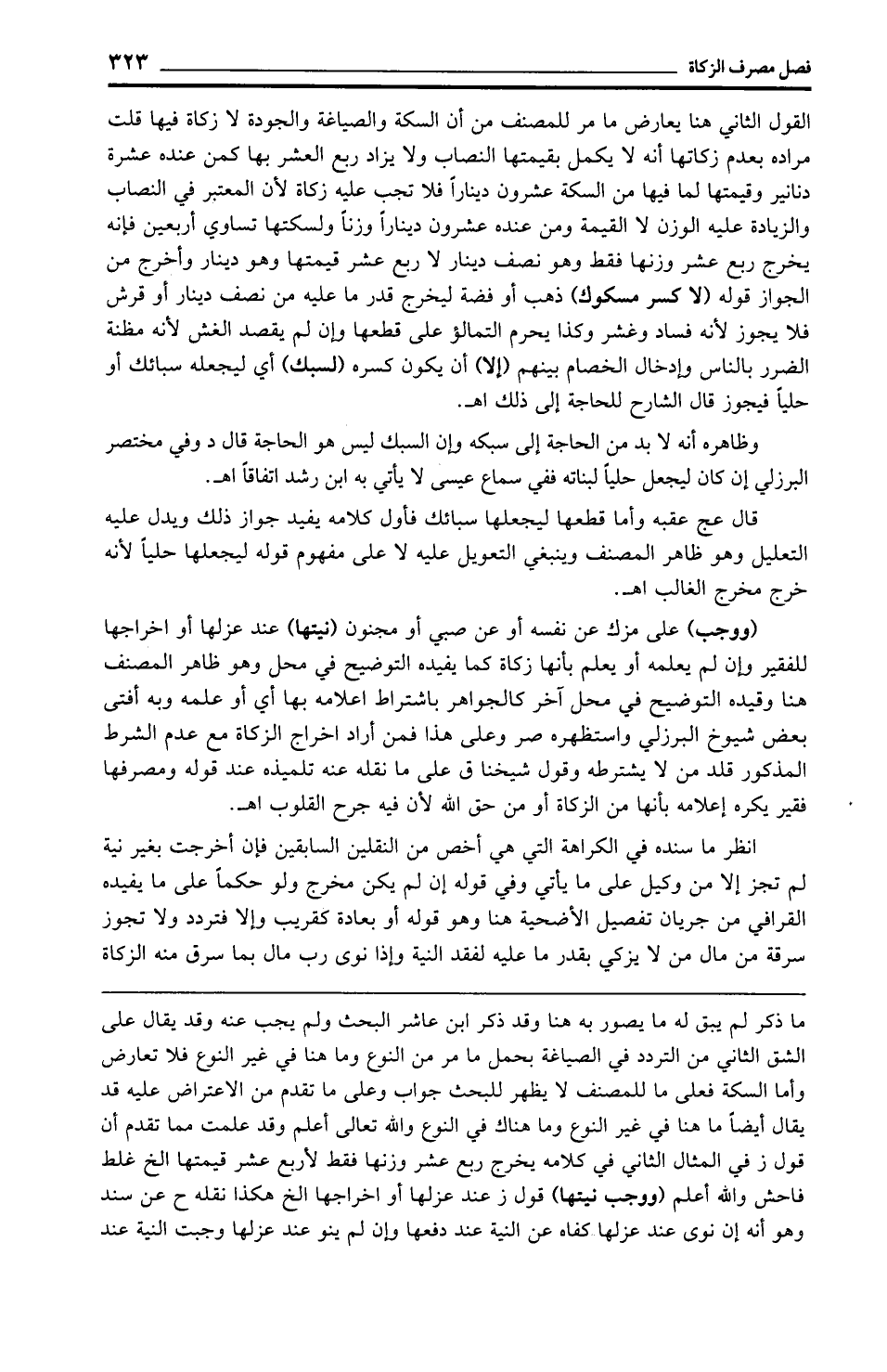 ما ذكر لم يبق له ما يصور به هنا وقد ذكر ابن عاشر البحث ولم يجب عنه وقد يقال على الشق الثاني من التردد في الصياغة يحمل ما مر من النوع وما هنا في غير النوع فلا تعارض وأما السكة فعلى ما للمصنف لا يظهر للبحث جواب وعلى ما تقدم من الاعتراض عليه قد يقال أيضًا ما هنا في غير النوع وما هناك في النوع والله تعالى أعلم وقد علمت مما تقدم أن قول ز في المثال الثاني في كلامه يخرج ربع عشر وزنها فقط لأربع عشر قيمتها الخ غلط فاحش والله أعلم (ووجب نيتها) قول ز عند عزلها أو إخراجها الخ هكذا نقله ح عن سند وهو أنه إن نوى عند عزلها كفاه عن النية عند دفعها وإن لم ينو عند عزلها وجبت النية عند