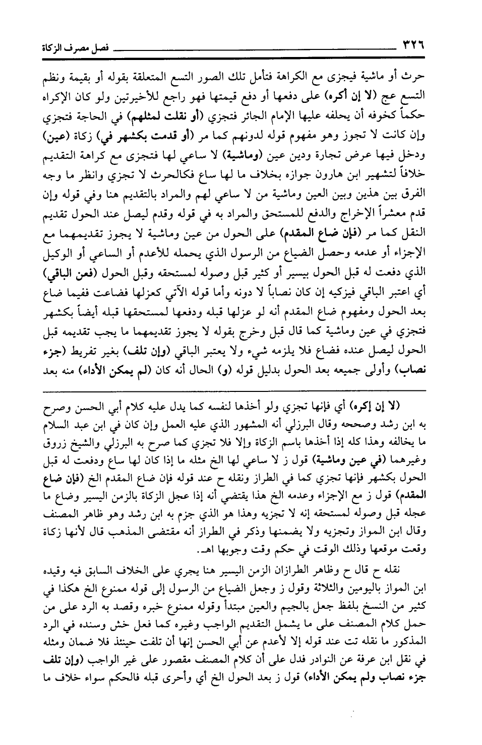 حرث أو ماشية فيجزى مع الكراهة فتأمل تلك الصور التسع المتعلقة بقوله أو بقيمة ونظم التسع عج (لا إن أكره) على دفعها أو دفع قيمتها فهو راجع للأخيرتين ولو كان الإكراه حكمًا كخوفه أن يحلفه عليها الإمام الجائر فتجزي (أو نقلت لمثلهم) في الحاجة فتجزي وإن كانت لا تجوز وهو مفهوم قوله لدونهم كما مر (أو قدمت بكشهر في) زكاة (عين) ودخل فيها عرض تجارة ودين عين (وماشية) لا ساعي لها فتجزى مع كراهة التقديم خلافًا لتشهير ابن هارون جوازه بخلاف ما لها ساع فكالحرث لا تجزي وانظر ما وجه الفرق بين هذين وبين العين وماشية من لا ساعي لهم والمراد بالتقديم هنا وفي قوله وإن قدم معشرًا الإخراج والدفع للمستحق والمراد به في قوله وقدم ليصل عند الحول تقديم النقل كما مر (فإن ضاع المقدم) على الحول من عين وماشية لا يجوز تقديمهما مع الإجزاء أو عدمه وحصل الضياع من الرسول الذي يحمله للأعدم أو الساعي أو الوكيل الذي دفعت له قبل الحول بيسير أو كثير قبل وصوله لمستحقه وقبل الحول (فعن الباقي) أي اعتبر الباقي فيزكيه إن كان نصابًا لا دونه وأما قوله الآتي كعزلها فضاعت ففيما ضاع بعد الحول ومفهوم ضاع المقدم أنه لو عزلها قبله ودفعها لمستحقها قبله أيضًا بكشهر فتجزي في عين وماشية كما قال قبل وخرج بقوله لا يجوز تقديمهما ما يجب تقديمه قبل الحول ليصل عنده فضاع فلا يلزمه شيء ولا يعتبر الباقي (وإن تلف) بغير تفريط (جزء نصاب) وأولى جميعه بعد الحول بدليل قوله (و) الحال أنه كان (لم يمكن الأداء) منه بعد