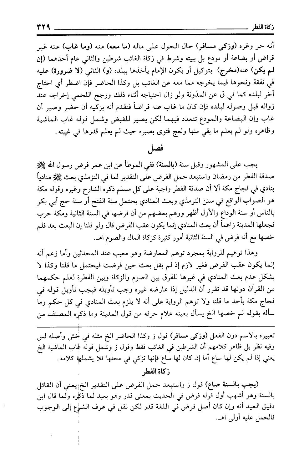 تعبيره بالاسم دون الفعل (وزكى مسافر) قول ز وكذا الحاضر الخ مثله في خش وأصله لس وفيه نظر بل ظاهر كلامهم أن الشرطين في الغائب فقط وقول ز وشمل قوله غاب الماشية الخ يعني إذا لم يكن لها ساع أما إن كان لها ساع فإنها تزكي في محلها فلا يشملها كلامه.