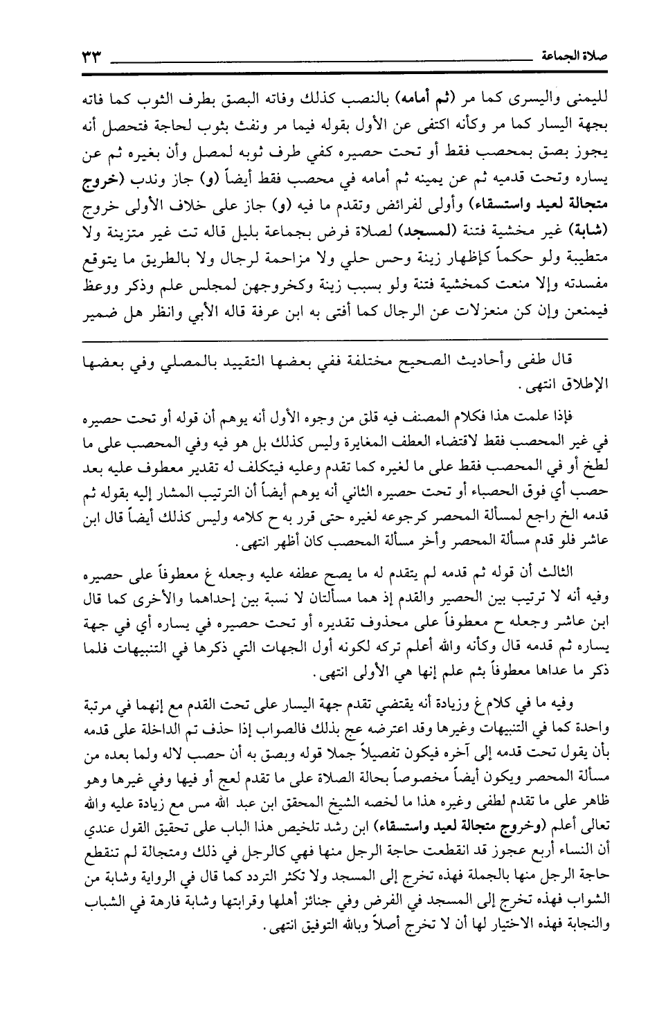 وفيه ما في كلام غ وزيادة أنه يقتضي تقدم جهة اليسار على تحت القدم مع إنهما في مرتبة واحدة كما في التنبيهات وغيرها وقد اعترضه عج بذلك فالصواب إذا حذف تم الداخلة على قدمه بأن يقول تحت قدمه إلى آخره فيكون تفصيلًا جملا قوله وبصق به أن حصب لاله ولما بعده من مسألة المحصر ويكون أيضًا مخصوصًا بحالة الصلاة على ما تقدم لعج أو فيها وفي غيرها وهو ظاهر على ما تقدم لطفى وغيره هذا ما لخصه الشيخ المحقق ابن عبد الله مس مع زيادة عليه والله تعالى أعلم (وخروج متجالة لعيد واستسقاء) ابن رشد تلخيص هذا الباب على تحقيق القول عندي أن النساء أربع عجوز قد انقطعت حاجة الرجل منها فهي كالرجل في ذلك ومتجالة لم تنقطع حاجة الرجل منها بالجملة فهذه تخرج إلى المسجد ولا تكثر التردد كما قال في الرواية وشابة من الشواب فهذه تخرج إلى المسجد في الفرض وفي جنائز أهلها وقرابتها وشابة فارهة في الشباب والنجابة فهذه الاختيار لها أن لا تخرج أصلًا وبالله التوفيق انتهى.