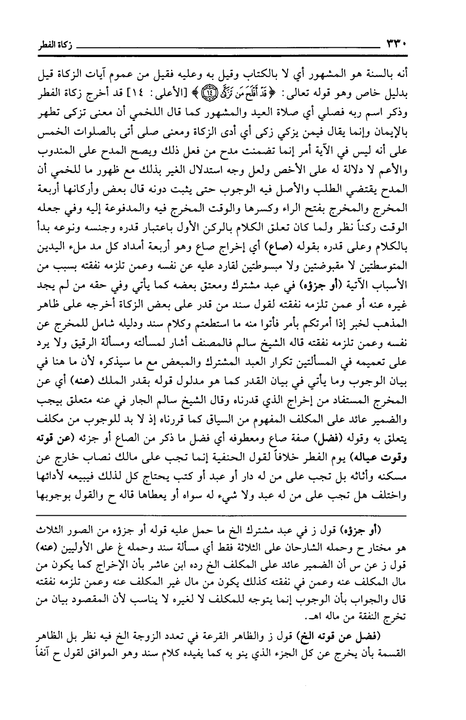 أنه بالسنة هو المشهور أي لا بالكتاب وقيل به وعليه فقيل من عموم آيات الزكاة قيل بدليل خاص وهو قوله تعالى: {قَدْ أَفْلَحَ مَنْ تَزَكَّى (14)} [الأعلى: 14] قد أخرج زكاة الفطر وذكر اسم ربه فصلي أي صلاة العيد والمشهور كما قال اللخمي أن معنى تزكى تطهير بالإيمان وإنما يقال فيمن يزكي زكى أي أدى الزكاة ومعنى صلى أتى بالصلوات الخمس على أنه ليس في الآية أمر إنما تضمنت مدح من فعل ذلك ويصح المدح على المندوب والأعم لا دلالة له على الأخص ولعل وجه استدلال الغير بذلك مع ظهور ما للخمي أن المدح يقتضي الطلب والأصل فيه الوجوب حتى يثبت دونه قال بعض وأركانها أربعة المخرج والمخرج بفتح الراء وكسرها والوقت المخرج فيه والمدفوعة إليه وفي جعله الوقت ركنًا نظر ولما كان تعلق الكلام بالركن الأول باعتبار قدره وجنسه ونوعه بدأ بالكلام وعلى قدره بقوله (صاع) أي إخراج صاع وهو أربعة أمداد كل مد ملء اليدين المتوسطتين لا مقبوضتين ولا مبسوطتين لقارد عليه عن نفسه وعمن تلزمه نفقته بسبب من الأسباب الآتية (أو جزؤه) في عبد مشترك ومعتق بعضه كما يأتي وفي حقه من لم يجد غيره عنه أو عمن تلزمه نفقته لقول سند من قدر على بعض الزكاة أخرجه على ظاهر المذهب لخبر إذا أمرتكم بأمر فأتوا منه ما استطعتم وكلام سند ودليله شامل للمخرج عن نفسه وعمن تلزمه نفقته قاله الشيخ سالم فالمصنف أشار لمسألته ومسألة الرقيق ولا يرد على تعميمه في المسألتين تكرار العبد المشترك والمبعض مع ما سيذكره لأن ما هنا في بيان الوجوب وما يأتي في بيان القدر كما هو مدلول قوله بقدر الملك (عنه) أي عن المخرج المستفاد من إخراج الذي قدرناه وقال الشيخ سالم الجار في عنه متعلق بيجب والضمير عائد على المكلف المفهوم من السياق كما قررناه إذ لا بد للوجوب من مكلف يتعلق به وقوله (فضل) صفة صاع ومعطوفه أي فضل ما ذكر من الصاع أو جزئه (عن قوته وقوت عياله) يوم الفطر خلافًا لقول الحنفية إنما تجب على مالك نصاب خارج عن مسكنه وأثاثه بل تجب على من له دار أو عبد أو كتب يحتاج كل لذلك فيبيعه لأدائها واختلف هل تجب على من له عبد ولا شيء له سواه أو يعطاها قاله ح والقول بوجوبها
