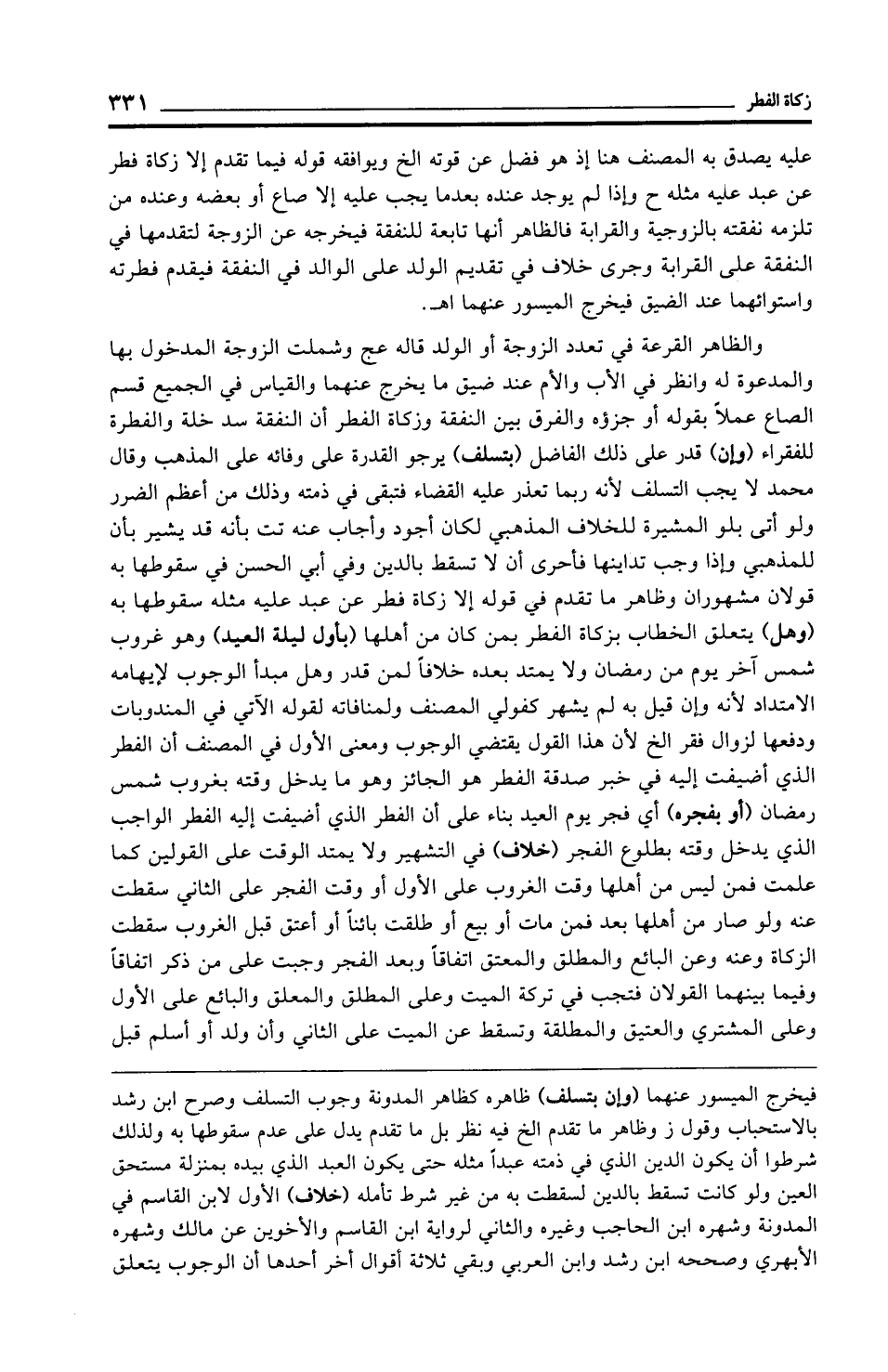 والظاهر القرعة في تعدد الزوجة أو الولد قاله عج وشملت الزوجة المدخول بها والمدعوة له وانظر في الأب والأم عند ضيق ما يخرج عنهما والقياس في الجميع قسم الصاع عملًا بقوله أو جزؤه والفرق بين النفقة وزكاة الفطر أن النفقة سد خلة والفطرة للفقراء (وإن) قدر على ذلك الفاضل (بتسلف) يرجو القدرة على وفائه على المذهب وقال محمد لا يجب التسلف لأنه ربما تعذر عليه القضاء فتبقى في ذمته وذلك من أعظم الضرر ولو أتى بلو المشيرة للخلاف المذهبي لكان أجود وأجاب عنه تت بأنه قد يشير بأن للمذهبي وإذا وجب تداينها فأحرى أن لا تسقط بالدين وفي أبي الحسن في سقوطها به قولان مشهوران وظاهر ما تقدم في قوله إلا زكاة فطر عن عبد عليه مثله سقوطها به (وهل) يتعلق الخطاب بزكاة الفطر بمن كان من أهلها (بأول ليلة العيد) وهو غروب شمس آخر يوم من رمضان ولا يمتد بعده خلافًا لمن قدر وهل مبدأ الوجوب لإيهامه الامتداد لأنه وإن قيل به لم يشهر كفولي المصنف ولمنافاته لقوله الآتي في المندوبات ودفعها لزوال فقر الخ لأن هذا القول يقتضي الوجوب ومعنى الأول في المصنف أن الفطر الذي أضيفت إليه في خبر صدقة الفطر هو الجائز وهو ما يدخل وقته بغروب شمس رمضان (أو بفجره) أي فجر يوم العيد بناء على أن الفطر الذي أضيفت إليه الفطر الواجب الذي يدخل وقته بطلوع الفجر (خلاف) في التشهير ولا يمتد الوقت على القولين كما علمت فمن ليس من أهلها وقت الغروب على الأول أو وقت الفجر على الثاني سقطت عنه ولو صار من أهلها بعد فمن مات أو بيع أو طلقت بائنًا أو أعتق قبل الغروب سقطت الزكاة وعنه وعن البائع والمطلق والمعتق اتفاقًا وبعد الفجر وجبت على من ذكر اتفاقًا وفيما بينهما القولان فتجب في تركة الميت وعلى المطلق والمعلق والبائع على الأول وعلى المشتري والعتيق والمطلقة وتسقط عن الميت على الثاني وأن ولد أو أسلم قبل