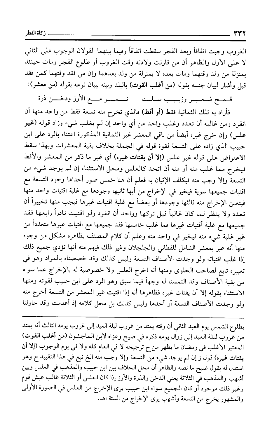 الغروب وجبت اتفاقًا وبعد الفجر سقطت اتفاقًا وفيما بينهما القولان الوجوب على الثاني لا على الأول والظاهر أن من قارنت ولادته وقت الغروب أو طلوع الفجر ومات حينئذ بمنزلة من ولد وقتهما ومات بعده لا بمنزلة من ولد بعدهما وإن من فقد وقتهما كمن فقد قبل وأشار لبيان جنسه بقوله (من أغلب القوت) بالبلد وبينه ببيان نوعه بقوله (من معشر):
