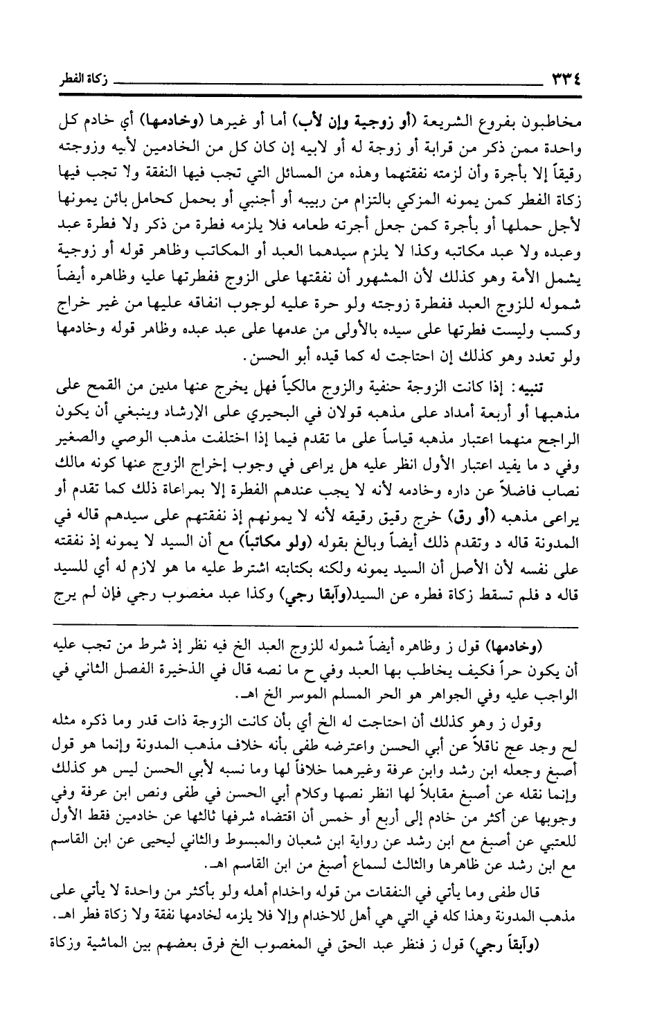 مخاطبون بفروع الشريعة (أو زوجية وإن لأب) أما أو غيرها (وخادمها) أي خادم كل واحدة ممن ذكر من قرابة أو زوجة له أو لأبيه إن كان كل من الخادمين لأبيه وزوجته رقيقًا إلا بأجرة وأن لزمته نفقتهما وهذه من المسائل التي تجب فيها النفقة ولا تجب فيها زكاة الفطر كمن يمونه المزكي بالتزام من ربيبه أو أجنبي أو بحمل كحامل بائن يمونها لأجل حملها أو بأجرة كمن جعل أجرته طعامه فلا يلزمه فطرة من ذكر ولا فطرة عبد وعبده ولا عبد مكاتبه وكذا لا يلزم سيدهما العبد أو المكاتب وظاهر قوله أو زوجية يشمل الأمة وهو كذلك لأن المشهور أن نفقتها على الزوج ففطرتها عليه وظاهره أيضًا شموله للزوج العبد ففطرة زوجته ولو حرة عليه لوجوب إنفاقه عليها من غير خراج وكسب وليست فطرتها على سيده بالأولى من عدمها على عبد عبده وظاهر قوله وخادمها ولو تعدد وهو كذلك إن احتاجت له كما قيده أبو الحسن.