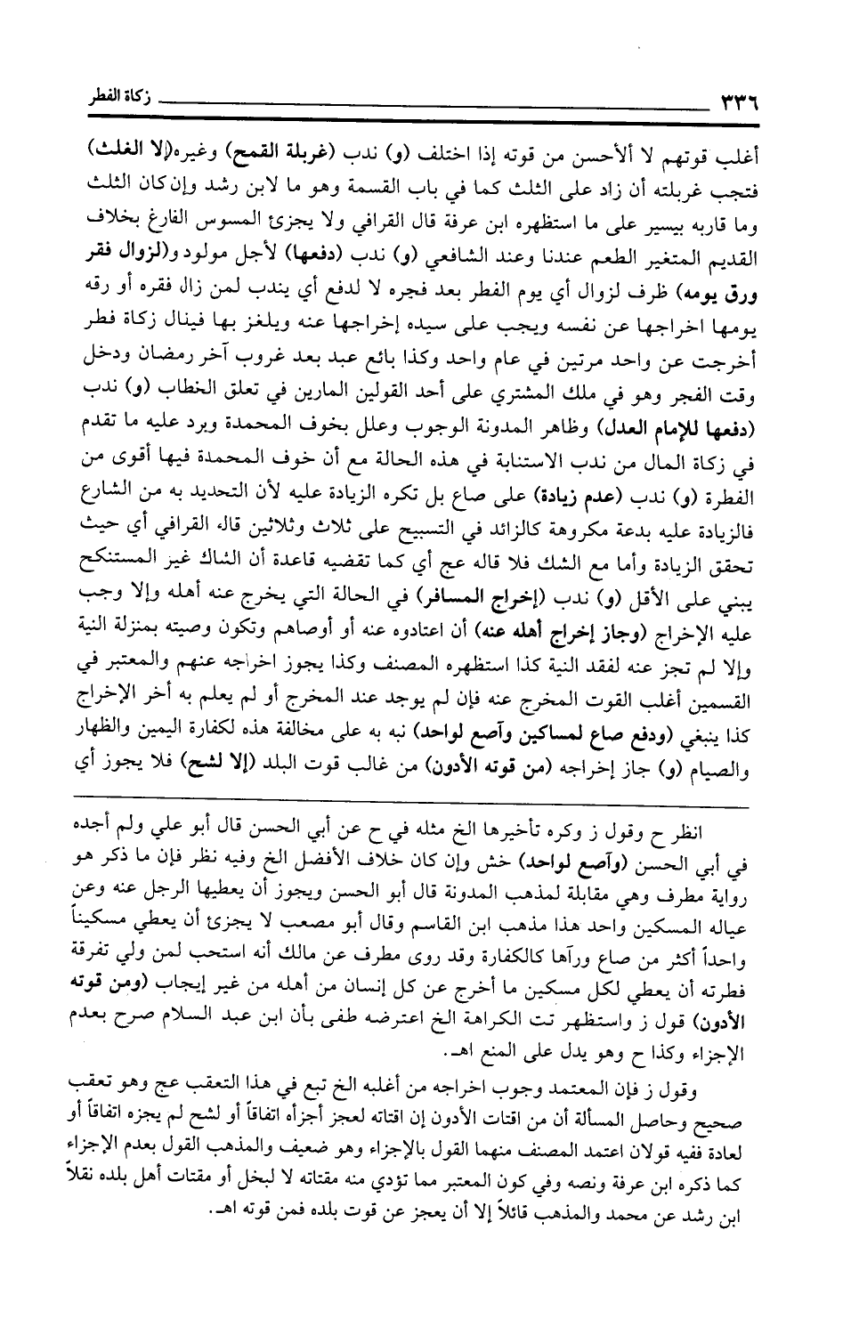 أغلب قوتهم لا الأحسن من قوته إذا اختلف (و) ندب (غربلة القمح) وغيره (لا الغلث) فتجب غربلته أن زاد على الثلث كما في باب القسمة وهو ما لابن رشد وإن كان الثلث وما قاربه بيسير على ما استظهره ابن عرفة قال القرافي ولا يجزئ المسوس الفارغ بخلاف القديم المتغير الطعم عندنا وعند الشافعي (و) ندب (دفعها) لأجل مولود و (لزوال فقر ورق يومه) ظرف لزوال أي يوم الفطر بعد فجره لا لدفع أي يندب لمن زال فقره أو رقه يومها إخراجها عن نفسه ويجب على سيده إخراجها عنه ويلغز بها فينال زكاة فطر أخرجت عن واحد مرتين في عام واحد وكذا بائع عبد بعد غروب آخر رمضان ودخل وقت الفجر وهو في ملك المشتري على أحد القولين المارين في تعلق الخطاب (و) ندب (دفعها للإمام العدل) وظاهر المدونة الوجوب وعلل بخوف المحمدة وبرد عليه ما تقدم في زكاة المال من ندب الاستنابة في هذه الحالة مع أن خوف المحمدة فيها أقوى من الفطرة (و) ندب (عدم زيادة) على صاع بل تكره الزيادة عليه لأن التحديد به من الشارع فالزيادة عليه بدعة مكروهة كالزائد في التسبيح على ثلاث وثلاثين قال القرافي أي حيث تحقق الزيادة وأما مع الشك فلا قاله عج أي كما تقضيه قاعدة أن الشاك غير المستنكح يبني على الأقل (و) ندب (إخراج المسافر) في الحالة التي يخرج عنه أهله وإلا وجب عليه الإخراج (وجاز إخراج أهله عنه) أن اعتادوه عنه أو أوصاهم وتكون وصيته بمنزلة النية وإلا لم تجز عنه لفقد النية كذا استظهره المصنف وكذا يجوز إخراجه عنهم والمعتبر في القسمين أغلب القوت المخرج عنه فإن لم يوجد عند المخرج أو لم يعلم به أخر الإخراج كذا ينبغي (ودفع صاع لمساكين وآصع لواحد) نبه به على مخالفة هذه لكفارة اليمين والظهار والصيام (و) جاز إخراجه (من قوته الأدون) من غالب قوت البلد (إلا لشح) فلا يجوز أي