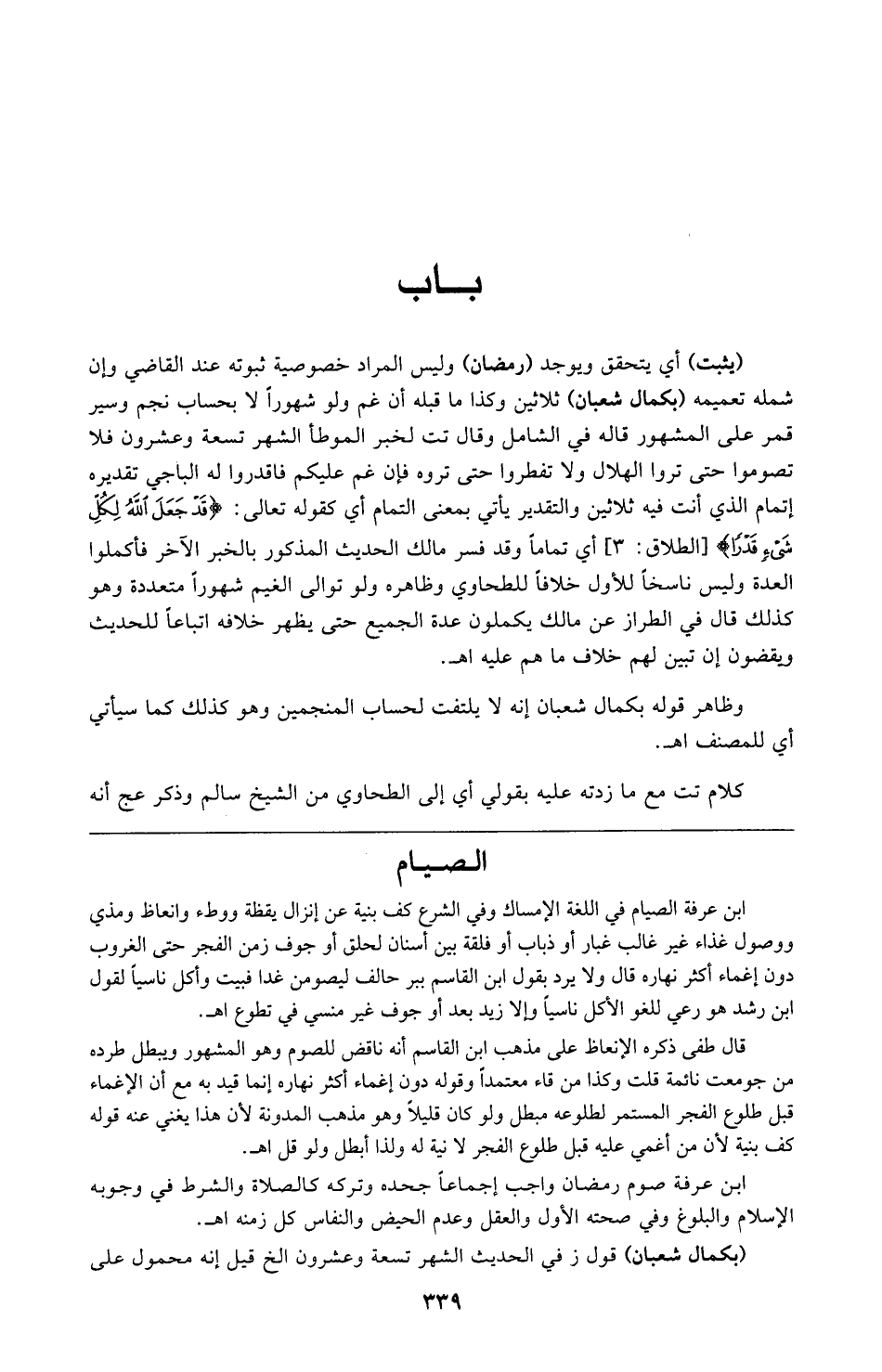 ابن عرفة الصيام في اللغة الإمساك وفي الشرع كف بنية عن إنزال يقظة ووطء وإنعاظ ومذي ووصول غذاء غير غالب غبار أو ذباب أو فلقة بين أسنان لحلق أو جوف زمن الفجر حتى الغروب دون إغماء أكثر نهاره قال ولا يرد بقول ابن القاسم ببر حالف ليصومن غدا فبيت وأكل ناسيًا لقول ابن رشد هو رعي للغو الأكل ناسيًا وإلا زيد بعد أو جوف غير منسي في تطوع اهـ.