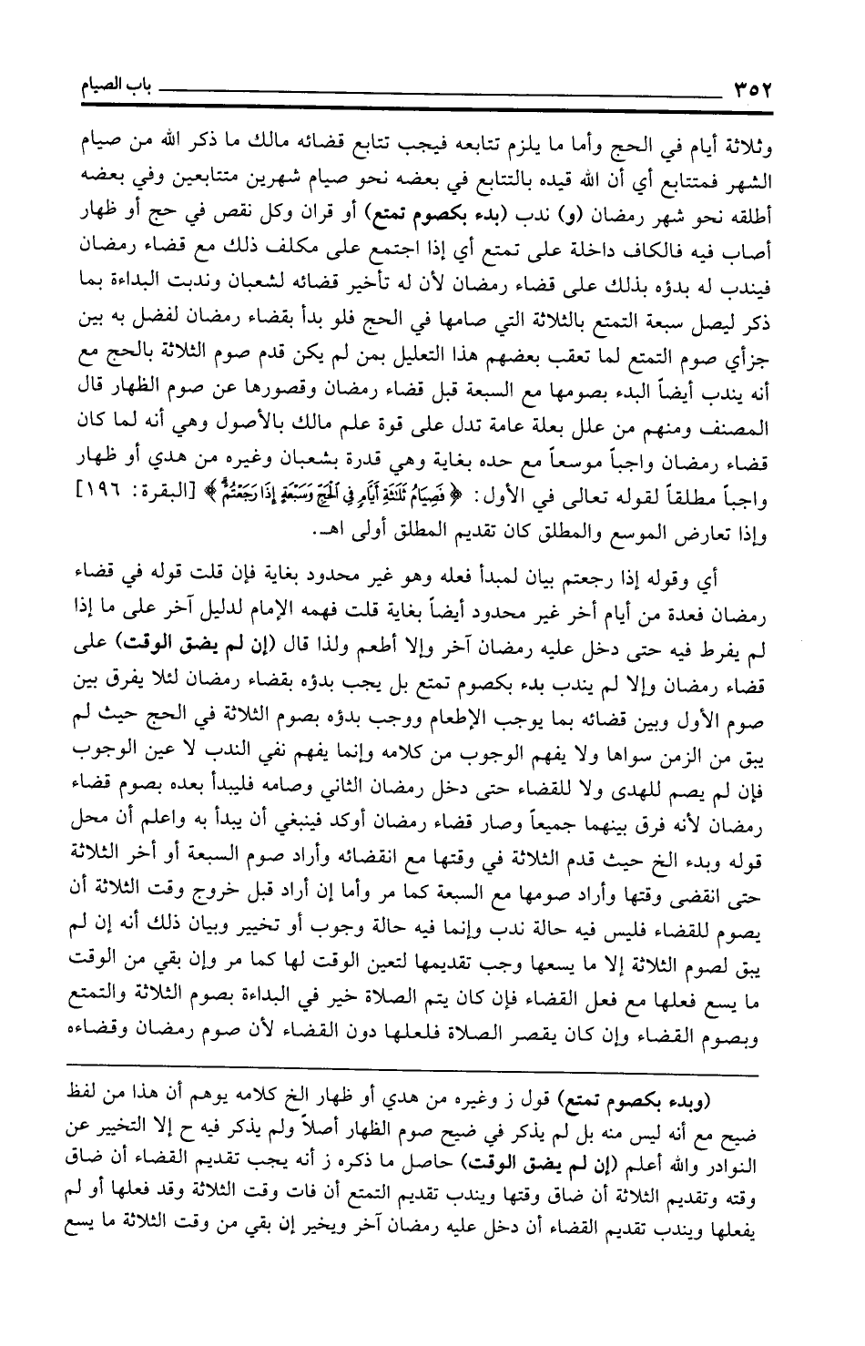وثلاثة أيام في الحج وأما ما يلزم تتابعه فيجب تتابع قضائه مالك ما ذكر الله من صيام الشهر فمتتابع أي أن الله قيده بالتتابع في بعضه نحو صيام شهرين متتابعين وفي بعضه أطلقه نحو شهر رمضان (و) ندب (بدء بكصوم تمتع) أو قرآن وكل نقص في حج أو ظهار أصاب فيه فالكاف داخلة على تمتع أي إذا اجتمع على مكلف ذلك مع قضاء رمضان فيندب له بدؤه بذلك على قضاء رمضان لأن له تأخير قضائه لشعبان وندبت البداءة بما ذكر ليصل سبعة التمتع بالثلاثة التي صامها في الحج فلو بدأ بقضاء رمضان لفضل به بين جزأي صوم التمتع لما تعقب بعضهم هذا التعليل بمن لم يكن قدم صوم الثلاثة بالحج مع أنه يندب أيضًا البدء بصومها مع السبعة قبل قضاء رمضان وقصورها عن صوم الظهار قال المصنف ومنهم من علل بعلة عامة تدل على قوة علم مالك بالأصول وهي أنه لما كان قضاء رمضان واجبًا موسعًا مع حده بغاية وهي قدرة بشعبان وغيره من هدي أو ظهار واجبًا مطلقًا لقوله تعالى في الأول: {فَصِيَامُ ثَلَاثَةِ أَيَّامٍ في الْحَجِّ وَسَبْعَةٍ إِذَا رَجَعْتُمْ} [البقرة: 196] وإذا تعارض الموسع والمطلق كان تقديم المطلق أولى اهـ.