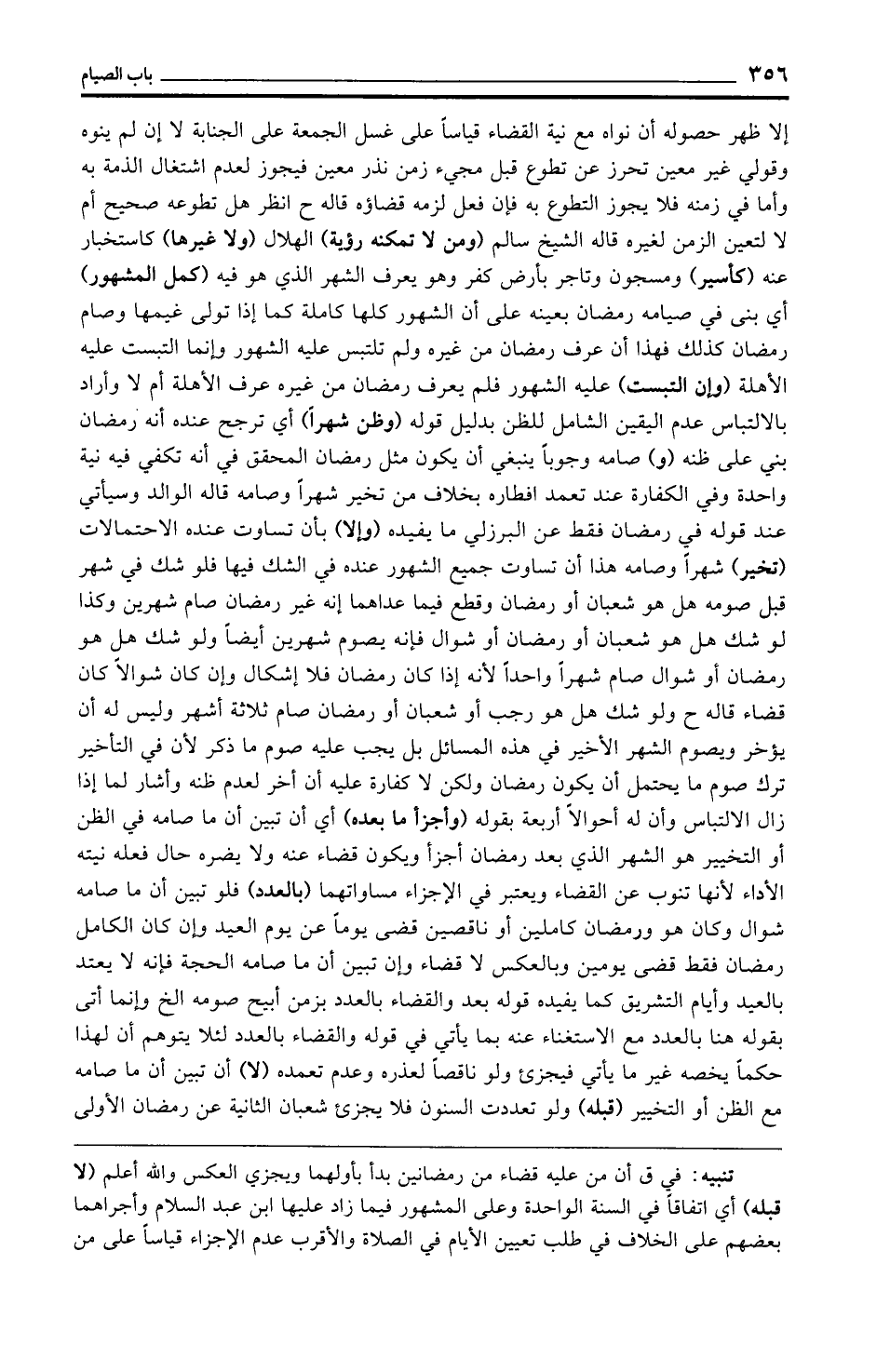 إلا ظهر حصوله أن نواه مع نية القضاء قياسًا على غسل الجمعة على الجنابة لا إن لم ينوه وقولي غير معين تحرز عن تطوع قبل مجيء زمن نذر معين فيجوز لعدم اشتغال الذمة به وأما في زمنه فلا يجوز التطوع به فإن فعل لزمه قضاؤه قاله ح انظر هل تطوعه صحيح أم لا لتعين الزمن لغيره قاله الشيخ سالم (ومن لا تمكنه رؤية) الهلال (ولا غيرها) كاستخبار عنه (كأسير) ومسجون وتاجر بأرض كفر وهو يعرف الشهر الذي هو فيه (كمل المشهور) أي بنى في صيامه رمضان بعينه على أن المشهور كلها كاملة كما إذا تولى غيمها وصام رمضان كذلك فهذا أن عرف رمضان من غيره ولم تلتبس عليه المشهور وإنما التبست عليه الأهلة (وإن التبست) عليه المشهور فلم يعرف رمضان من غيره عرف الأهلة أم لا وأراد بالالتباس عدم اليقين الشامل للظن بدليل قوله (وظن شهرًا) أي ترجح عنده أنه رمضان بني على ظنه (و) صامه وجوبًا ينبغي أن يكون مثل رمضان المحقق في أنه تكفي فيه نية واحدة وفي الكفارة عند تعمد إفطاره بخلاف من تخير شهرًا وصامه قاله الوالد وسيأتي عند قوله في رمضان فقط عن البرزلي ما يفيده (وإلا) بأن تساوت عنده الاحتمالات (تخير) شهرًا وصامه هذا أن تساوت جميع المشهور عنده في الشك فيها فلو شك في شهر قبل صومه هل هو شعبان أو رمضان وقطع فيما عداهما إنه غير رمضان صام شهرين وكذا لو شك هل هو شعبان أو رمضان أو شوال فإنه يصوم شهرين أيضًا ولو شك هل هو رمضان أو شوال صام شهرًا واحدًا لأنه إذا كان رمضان فلا إشكال وإن كان شوالًا كان قضاء قاله ح ولو شك هل هو رجب أو شعبان أو رمضان صام ثلاثة أشهر وليس له أن يؤخر ويصوم الشهر الأخير في هذه المسائل بل يجب عليه صوم ما ذكر لأن في التأخير ترك صوم ما يحتمل أن يكون رمضان ولكن لا كفارة عليه أن أخر لعدم ظنه وأشار لما إذا زال الالتباس وأن له أحوالًا أربعة بقوله (وأجزأ ما بعده) أي أن تبين أن ما صامه في الظن أو التخيير هو الشهر الذي بعد رمضان أجزأ ويكون قضاء عنه ولا يضره حال فعله نيته الأداء لأنها تنوب عن القضاء ويعتبر في الإجزاء مساواتهما (بالعدد) فلو تبين أن ما صامه شوال وكان هو ورمضان كاملين أو ناقصين قضى يومًا عن يوم العيد وإن كان الكامل رمضان فقط قضى يومين وبالعكس لا قضاء وإن تبين أن ما صامه الحجة فإنه لا يعتد بالعيد وأيام التشريق كما يفيده قوله بعد والقضاء بالعدد بزمن أبيح صومه الخ وإنما أتى بقوله هنا بالعدد مع الاستغناء عنه بما يأتي في قوله والقضاء بالعدد لئلا يتوهم أن لهذا حكمًا يخصه غير ما يأتي فيجزئ ولو ناقصًا لعذره وعدم تعمده (لا) أن تبين أن ما صامه مع الظن أو التخيير (قبله) ولو تعددت السنون فلا يجزئ شعبان الثانية عن رمضان الأولى