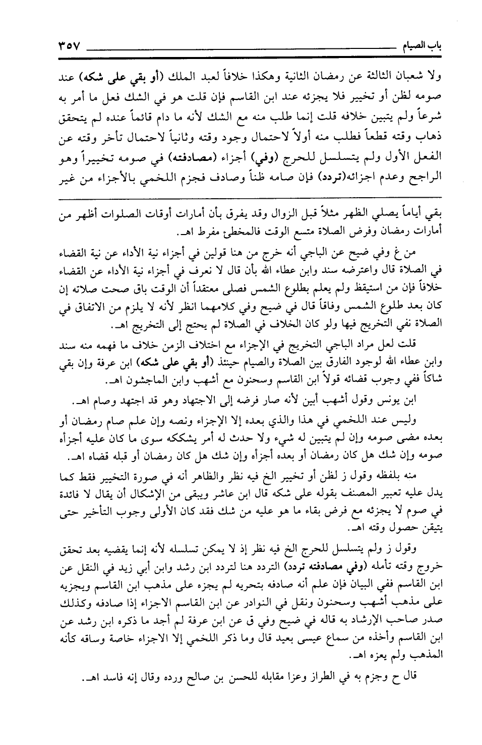 قلت لعل مراد الباجي التخريج في الإجزاء مع اختلاف الزمن خلاف ما فهمه منه سند وابن عطاء الله لوجود الفارق بين الصلاة والصيام حينئذ (أو بقي على شكه) ابن عرفة وإن بقي شاكًّا ففي وجوب قضائه قولًا ابن القاسم وسحنون مع أشهب وابن الماجشون اهـ.