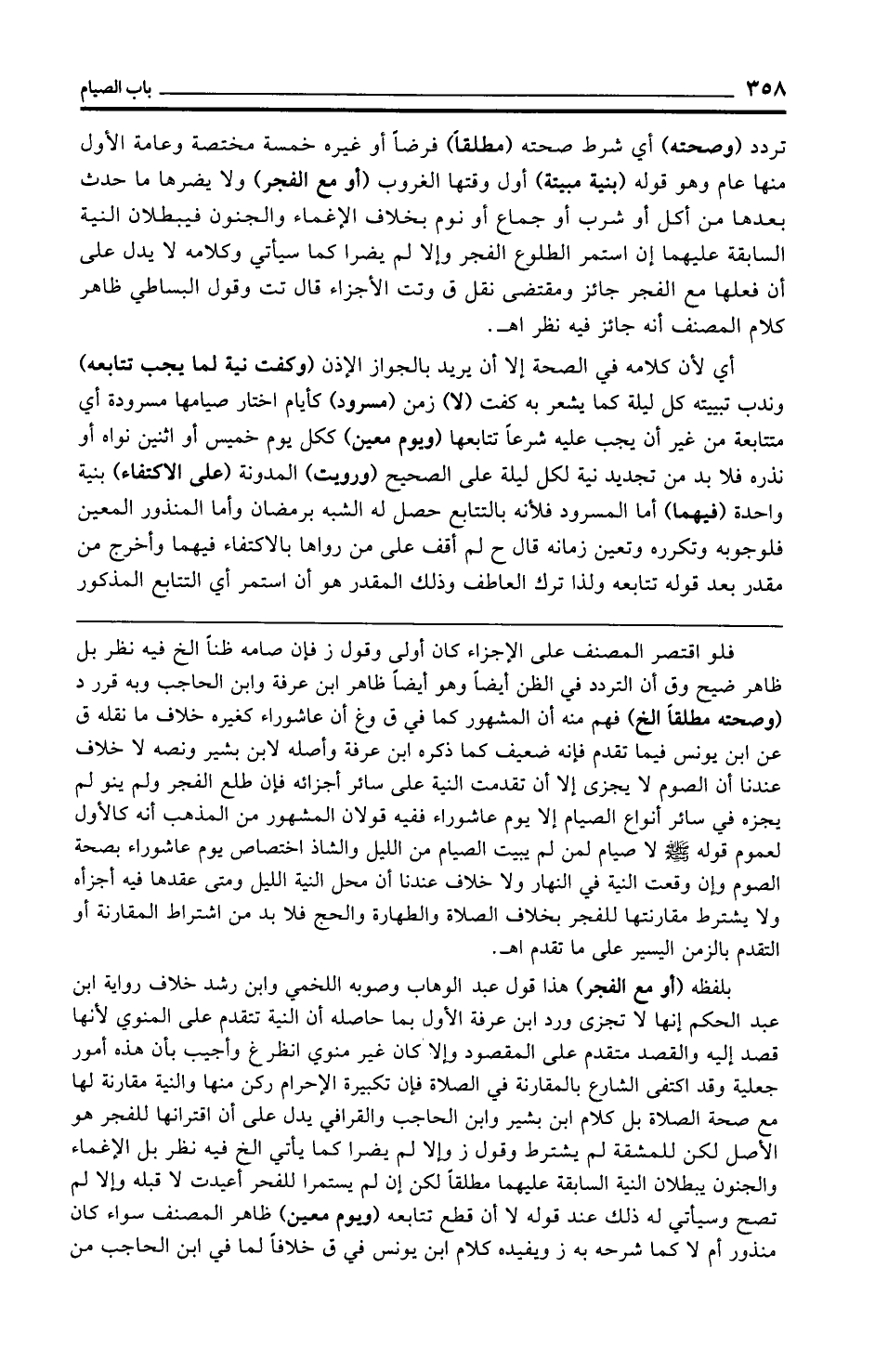 بلفظه (أو مع الفجر) هذا قول عبد الوهاب وصوبه اللخمي وابن رشد خلاف رواية ابن عبد الحكم إنها لا تجزى ورد ابن عرفة الأول بما حاصله أن النية تتقدم على المنوي لأنها قصد إليه والقصد متقدم على المقصود وإلا كان غير منوي انظر غ وأجيب بأن هذه أمور جعلية وقد اكتفى الشارع بالمقارنة في الصلاة فإن تكبيرة الإحرام ركن منها والنية مقارنة لها مع صحة الصلاة بل كلام ابن بشير وابن الحاجب والقرافي يدل على أن اقترانها للفجر هو الأصل لكن للمشقة لم يشترط وقول ز وإلا لم يضرا كما يأتي الخ فيه نظر بل الإغماء والجنون يبطلان النية السابقة عليهما مطلقًا لكن إن لم يستمرا للفجر أعيدت لا قبله وإلا لم تصح وسيأتي له ذلك عند قوله لا أن قطع تتابعه (ويوم معين) ظاهر المصنف سواء كان منذور أم لا كما شرحه به ز ويفيده كلام ابن يونس في ق خلافًا لما في ابن الحاجب من