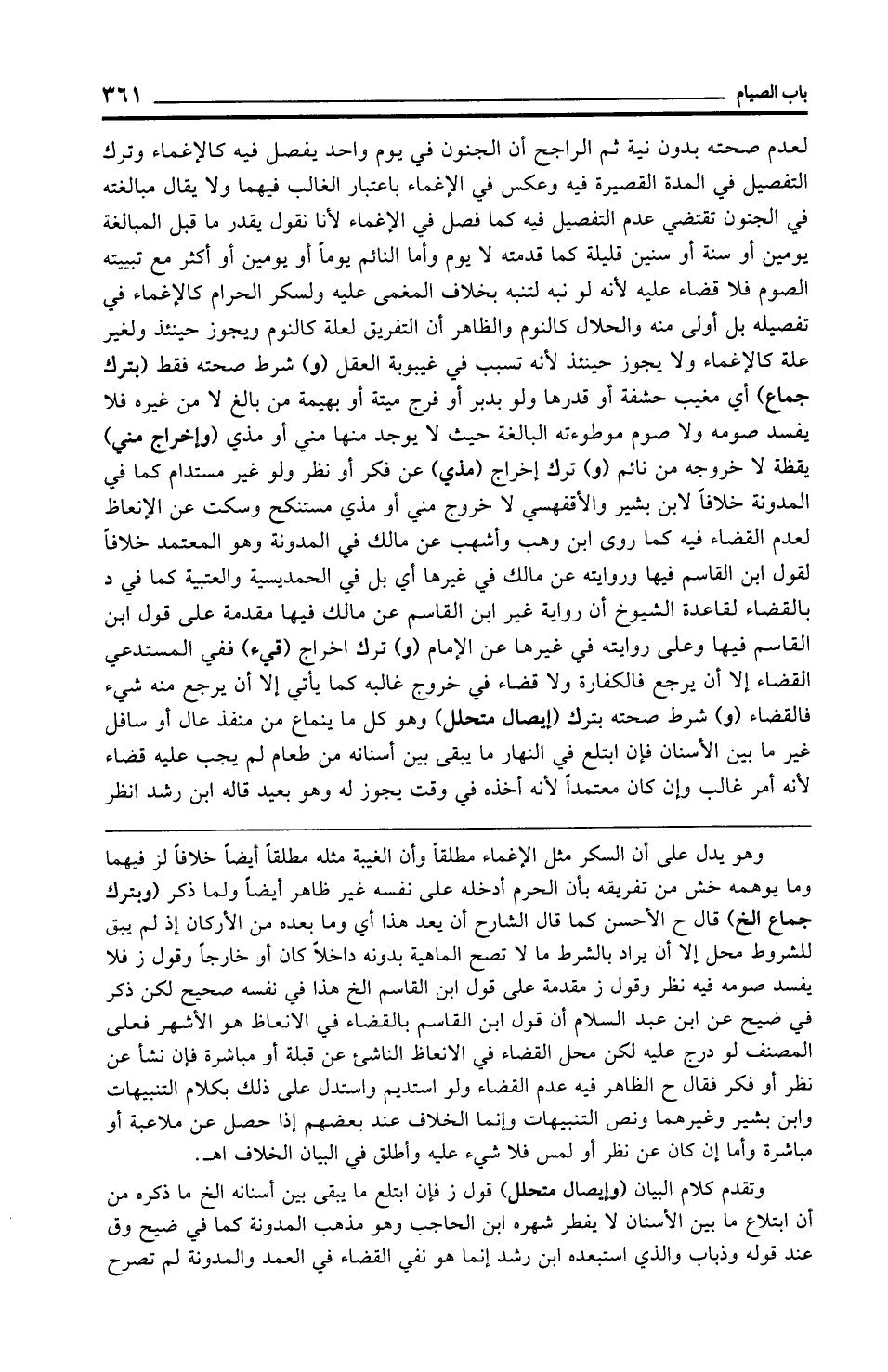 لعدم صحته بدون نية ثم الراجح أن الجنون في يوم واحد يفصل فيه كالإغماء وترك التفصيل في المدة القصيرة فيه وعكس في الإغماء باعتبار الغالب فيهما ولا يقال مبالغته في الجنون تقتضي عدم التفصيل فيه كما فصل في الإغماء لأنا نقول يقدر ما قبل المبالغة يومين أو سنة أو سنين قليلة كما قدمته لا يوم وأما النائم يومًا أو يومين أو أكثر مع تبييته الصوم فلا قضاء عليه لأنه لو نبه لتنبه بخلاف المغمى عليه ولسكر الحرام كالإغماء في تفصيله بل أولى منه والحلال كالنوم والظاهر أن التفريق لعلة كالنوم ويجوز حينئذ ولغير علة كالإغماء ولا يجوز حينئذ لأنه تسبب في غيبوبة العقل (و) شرط صحته فقط (بترك جماع) أي مغيب حشفة أو قدرها ولو بدبر أو فرج ميتة أو بهيمة من بالغ لا من غيره فلا يفسد صومه ولا صوم موطوءته البالغة حيث لا يوجد منها مني أو مذي (وإخراج مني) يقظة لا خروجه من نائم (و) ترك إخراج (مذي) عن فكر أو نظر ولو غير مستدام كما في المدونة خلافًا لابن بشير والأقفهسي لا خروج مني أو مذي مستنكح وسكت عن الإنعاظ لعدم القضاء فيه كما روى ابن وهب وأشهب عن مالك في المدونة وهو المعتمد خلافًا لقول ابن القاسم فيها وروايته عن مالك في غيرها أي بل في الحمديسية والعتبية كما في د بالقضاء لقاعدة الشيوخ أن رواية غير ابن القاسم عن مالك فيها مقدمة على قول ابن القاسم فيها وعلى روايته في غيرها عن الإِمام (و) ترك إخراج (قيء) ففي المستدعي القضاء إلا أن يرجع فالكفارة ولا قضاء في خروج غالبه كما يأتي إلا أن يرجع منه شيء فالقضاء (و) شرط صحته بترك (إيصال متحلل) وهو كل ما ينماع من منفذ عال أو سافل غير ما بين الأسنان فإن ابتلع في النهار ما يبقى بين أسنانه من طعام لم يجب عليه قضاء لأنه أمر غالب وإن كان معتمدًا لأنه أخذه في وقت يجوز له وهو بعيد قاله ابن رشد انظر