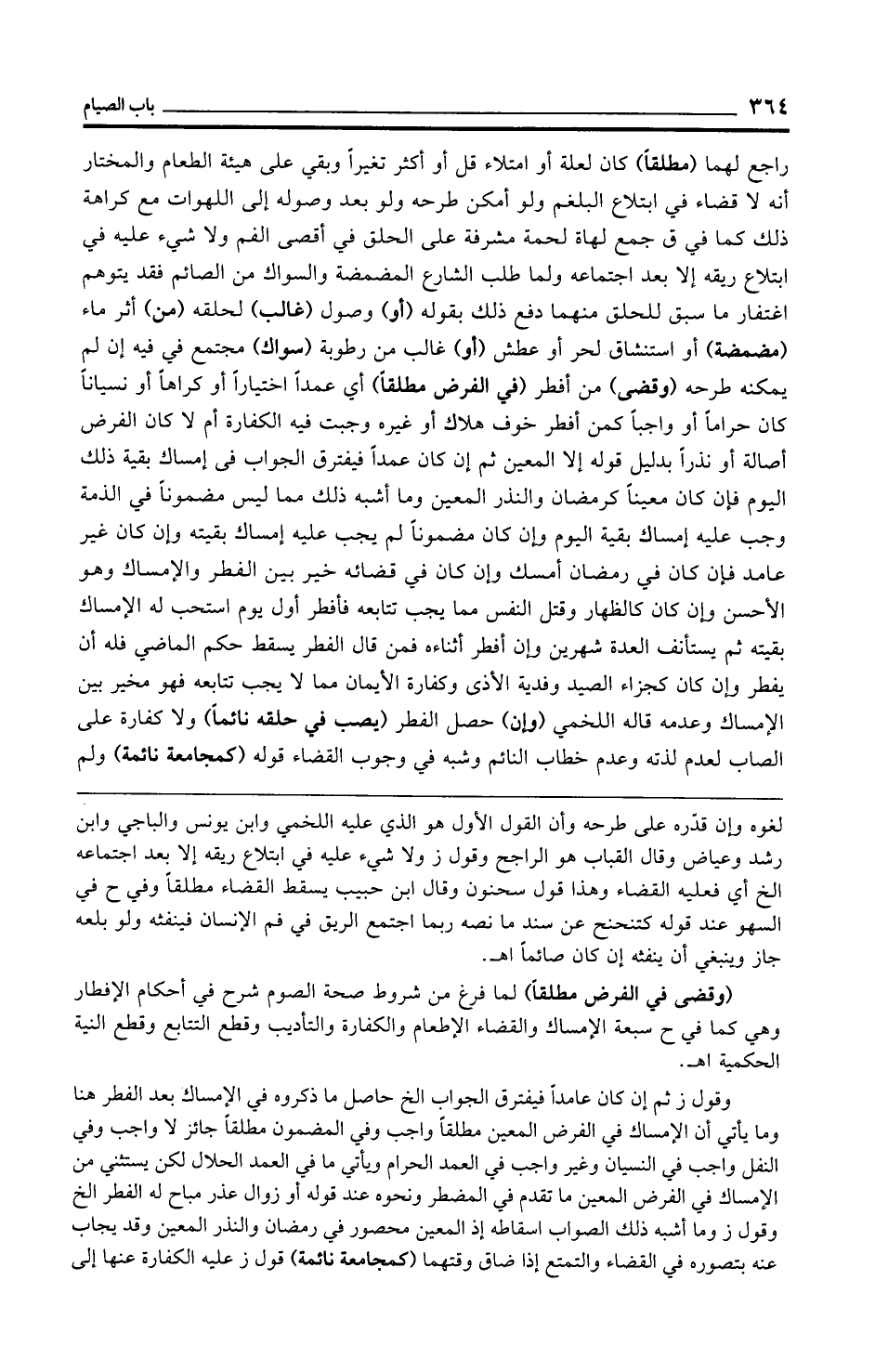 راجع لهما (مطلقًا) كان لعلة أو امتلاء قل أو أكثر تغيرًا وبقي على هيئة الطعام والمختار أنه لا قضاء في ابتلاع البلغم ولو أمكن طرحه ولو بعد وصوله إلى اللهوات مع كراهة ذلك كما في ق جمع لهاة لحمة مشرفة على الحلق في أقصى الفم ولا شيء عليه في ابتلاع ريقه إلا بعد اجتماعه ولما طلب الشارع المضمضة والسواك من الصائم فقد يتوهم اغتفار ما سبق للحلق منهما دفع ذلك بقوله (أو) وصول (غالب) لحلقه (من) أثر ماء (مضمضة) أو استنشاق لحر أو عطش (أو) غالب من رطوبة (سواك) مجتمع في فيه إن لم يمكنه طرحه (وقضى) من أفطر (في الفرض مطلقًا) أي عمدًا اختيارًا أو كراهًا أو نسيانًا كان حرامًا أو واجبًا كمن أفطر خوف هلاك أو غيره وجبت فيه الكفارة أم لا كان الفرض أصالة أو نذرًا بدليل قوله إلا المعين ثم إن كان عمدًا فيفترق الجواب في إمساك بقية ذلك اليوم فإن كان معينًا كرمضان والنذر المعين وما أشبه ذلك مما ليس مضمونًا في الذمة وجب عليه إمساك بقية اليوم وإن كان مضمونًا لم يجب عليه إمساك بقيته وإن كان غير عامد فإن كان في رمضان أمسك وإن كان في قضائه خير بين الفطر والإمساك وهو الأحسن وإن كان كالظهار وقتل النفس مما يجب تتابعه فأفطر أول يوم استحب له الإمساك بقيته ثم يستأنف العدة شهرين وإن أفطر أثناءه فمن قال الفطر يسقط حكم الماضي فله أن يفطر وإن كان كجزاء الصيد وفدية الأذى وكفارة الأيمان مما لا يجب تتابعه فهو غير بين الإمساك وعدمه قاله اللخمي (وإن) حصل الفطر (يصب في حلقه نائمًا) ولا كفارة على الصاب لعدم لذته وعدم خطاب النائم وشبه في وجوب القضاء قوله (كمجامعة نائمة) ولم