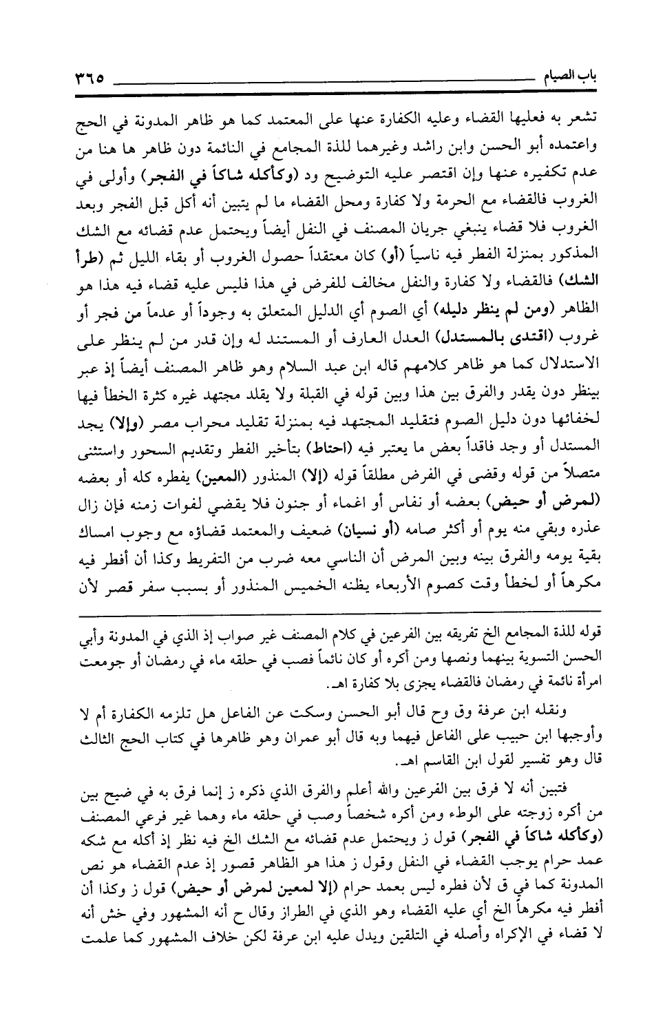 تشعر به فعليها القضاء وعليه الكفارة عنها على المعتمد كما هو ظاهر المدونة في الحج واعتمده أبو الحسن وابن راشد وغيرهما للذة المجامع في النائمة دون ظاهر ها هنا من عدم تكفيره عنها وإن اقتصر عليه التوضيح ود (وكأكله شاكًّا في الفجر) وأولى في الغروب فالقضاء مع الحرمة ولا كفارة ومحل القضاء ما لم يتبين أنه أكل قبل الفجر وبعد الغروب فلا قضاء ينبغي جريان المصنف في النفل أيضًا ويحتمل عدم قضائه مع الشك المذكور بمنزلة الفطر فيه ناسيًا (أو) كان معتقدًا حصول الغروب أو بقاء الليل ثم (طرأ الشك) فالقضاء ولا كفارة والنفل مخالف للفرض في هذا فليس عليه قضاء فيه هذا هو الظاهر (ومن لم ينظر دليله) أي الصوم أي الدليل المتعلق به وجودًا أو عدمًا من فجر أو غروب (اقتدى بالمستدل) العدل العارف أو المستند له وإن قدر من لم ينظر على الاستدلال كما هو ظاهر كلامهم قاله ابن عبد السلام وهو ظاهر المصنف أيضًا إذ عبر بينظر دون يقدر والفرق بين هذا وبين قوله في القبلة ولا يقلد مجتهد غيره كثرة الخطأ فيها لخفائها دون دليل الصوم فتقليد المجتهد فيه بمنزلة تقليد محراب مصر (وإلا) يجد المستدل أو وجد فاقدًا بعض ما يعتبر فيه (احتاط) تأخير الفطر وتقديم السحور واستثنى متصلًا من قوله وقضى في الفرض مطلقًا قوله (إلا) المنذور (المعين) يفطره كله أو بعضه (لمرض أو حيض) بعضه أو نفاس أو إغماء أو جنون فلا يقضي لفوات زمنه فإن زال عذره وبقي منه يوم أو أكثر صامه (أو نسيان) ضعيف والمعتمد قضاؤه مع وجوب إمساك بقية يومه والفرق بينه وبين المرض أن الناسي معه ضرب من التفريط وكذا أن أفطر فيه مكرهًا أو لخطأ وقت كصوم الأربعاء يظنه الخميس المنذور أو بسبب سفر قصر لأن