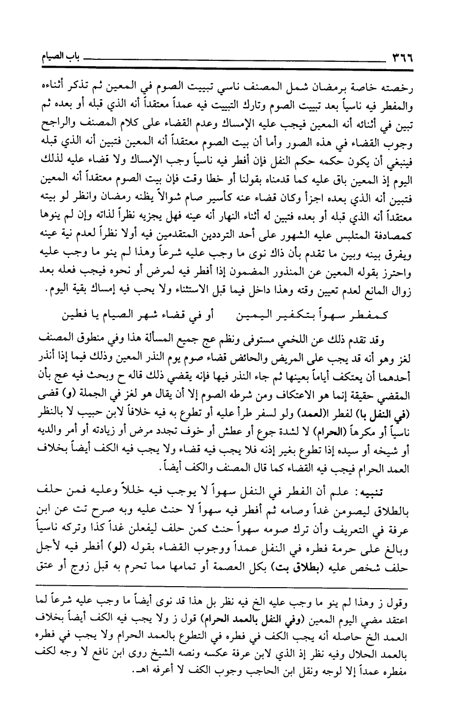 رخصته خاصة برمضان شمل المصنف ناسي تبييت الصوم في المعين ثم تذكر أثناءه والمفطر فيه ناسيًا بعد تبييت الصوم وتارك التبييت فيه عمدًا معتقدًا أنه الذي قبله أو بعده ثم تبين في أثنائه أنه المعين فيجب عليه الإمساك وعدم القضاء على كلام المصنف والراجح وجوب القضاء في هذه الصور وأما أن بيت الصوم معتقدًا أنه المعين فتبين أنه الذي قبله فينبغي أن يكون حكمه حكم النفل فإن أفطر فيه ناسيًا وجب الإمساك ولا قضاء عليه لذلك اليوم إذ المعين باق عليه كما قدمناه بقولنا أو خطأ وقت فإن بيت الصوم معتقدًا أنه المعين فتبين أنه الذي بعده أجزأ وكان قضاء عنه كأسير صام شوالًا يظنه رمضان وانظر لو بيته معتقدًا أنه الذي قبله أو بعده فتبين له أثناء النهار أنه عينه فهل يجزيه نظرًا لذاته وإن لم ينوها كمصادفة المتلبس عليه المشهور على أحد الترددين المتقدمين فيه أولًا نظرًا لعدم نية عينه ويفرق بينه وبين ما تقدم بأن ذاك نوى ما وجب عليه شرعًا وهذا لم ينو ما وجب عليه واحترز بقوله المعين عن المنذور المضمون إذا أفطر فيه لمرض أو نحوه فيجب فعله بعد زوال المانع لعدم تعيين وقته وهذا داخل فيما قبل الاستثناء ولا يحب فيه إمساك بقية اليوم.