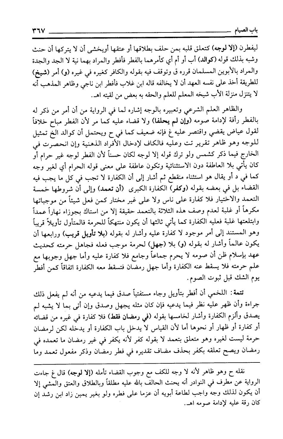 والظاهر العلم الشرعي وتعبيره بالوجه إشاره لما في الرواية من أن أمر من ذكر له بالفطر رأفة لإدامة صومه (وإن لم يحلفا) ولا قضاء عليه كما مر لأن الفطر مباح خلافًا لقول عياض يقضي واقتصر عليه غ فإنه ضعيف كما في ح ويحتمل أن كوالد الخ تمثيل للوجه وهو ظاهر تقرير تت وعليه فالكاف لإدخال الأفراد الذهنية وإن انحصرت في الخارج فيما ذكر كشمس ولو ترك قوله إلا لوجه لكان حسنًا لأن الفطر لوجه غير حرام أو كان يأتي بلا العاطفة دون الاستثنائية وتكون عاطفة على معنى قوله الحرام أي لغير وجه كما في د أو يقال هو استثناء منقطع ثم أشار إلى أن الكفارة لا تجب في كل ما يجب فيه القضاء بل في بعضه بقوله (وكفر) الكفارة الكبرى (أن تعمد) وإلى أن شروطها خمسة التعمد والاختيار فلا كفارة على ناس ولا على غير مختار كمن فعل شيئًا من موجباتها مكرهًا أو غلبة لعدم وصف هذه الثلاثة بالتعمد حقيقة إلا من استاك بجوزاء نهارًا عمدًا وابتلعتها غلبة فعليه الكفارة كما يأتي ثالثها أن يكون منتهكًا للحرمة فالمتأول تأويلًا قريبًا وهو المستند إلى أمر موجود لا كفارة عليه وأشار له بقوله (بلا تأويل قريب) ورابعها أن يكون عالمًا وأشار له بقوله (و) بلا (جهل) لحرمة موجب فعله فجاهل حرمته كحديث عهد بإسلام ظن أن صومه لا يحرم جماعًا وجامع فلا كفارة عليه وأما جهل وجوبها مع علم حرمته فلا يسقط عنه الكفارة وأما جهل رمضان فتسقط معه الكفارة اتفاقًا كمن أفطر يوم الشك قبل ثبوت الصوم.