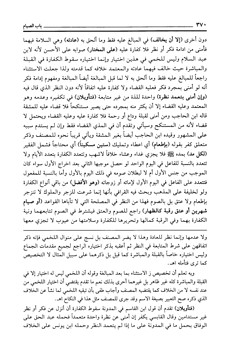 دون أخرى (إلا أن يخالف) في المبالغ عليه فقط وما ألحق به (عادته) وهي السلامة فيهما فأمنى من إدامة فكر أو نظر فلا كفارة عليه (على المختار) صوابه على الأحسن لأنه لابن عبد السلام وليس للخمي في هذين اختيار وإنما اختياره سقوط الكفارة في القبلة والمباشرة حيث خالف فيهما عادته والمعتمد خلافه كما قدمته ولذا جعلت الاستثناء راجعًا للمبالغ عليه فقط وما ألحق به لا لما قبل المبالغة أيضًا المبالغة ومفهوم إدامة فكر أنه لو أمنى بمجرد فكر فعليه القضاء ولا كفارة عليه اتفاقًا لأنه دون النظر الذي قال فيه (وإن أمنى بتعمد نظرة) واحدة للذة من غير متابعة (فتأويلان) في تكفيره وعدمه وهو المعتمد وعليه القضاء إلا أن يكثر منه بمجرده حتى يصير مستنكحًا فلا قضاء عليه للمشقة قاله ابن الحاجب ومن أمنى لقبلة وداع أو رحمة فلا كفارة عليه وعليه القضاء ويحتمل لا قضاء لأنه من المستنكح وسيأتي وتقدم أن في المذي القضاء فقط وإن لم يستدم سببه على المشهور وقيده ابن الحاجب أيضًا بغير المشقة ويأتي قريبًا نحوه للمصنف وذكر متعلق كفر بقوله (بإطعام) أي إعطاء وتمليك (ستين مسكينًا) أي محتاجًا فشمل الفقير (لكل مد) بمده - صلى الله عليه وسلم - فلا يجزي غداء وعشاء خلافًا لأشهب وتتعدد الكفارة بتعدد الأيام ولا تتعدد بالنسبة للفاعل في اليوم الواحد لو حصل موجبها الثاني بعد إخراج الأول سواء كان الموجب من جنس الأول أم لا لبطلان صومه في ذلك اليوم بالأول وأما بالنسبة للمفعول فتتعدد على الفاعل في اليوم الأول لإمائه أو زوجاته (وهو الأفضل) من باقي أنواع الكفارة ولو لخليفة على المذهب وبحث فيه القرافي بأنها إنما شرعت للزجر والملوك لا تنزجر بإطعام ولا عتق بل بالصوم فهذا من النظر في المصلحة التي لا تأباها القواعد (أو صيام شهرين أو عتق رقبة كالظهار) راجع للصوم والعتق فيشترط في الصوم تتابعهما ونية الكفارة بهما وفي الرقبة كمالها وتحريرها للكفارة وسلامتها من عيوب لا تجزي معها