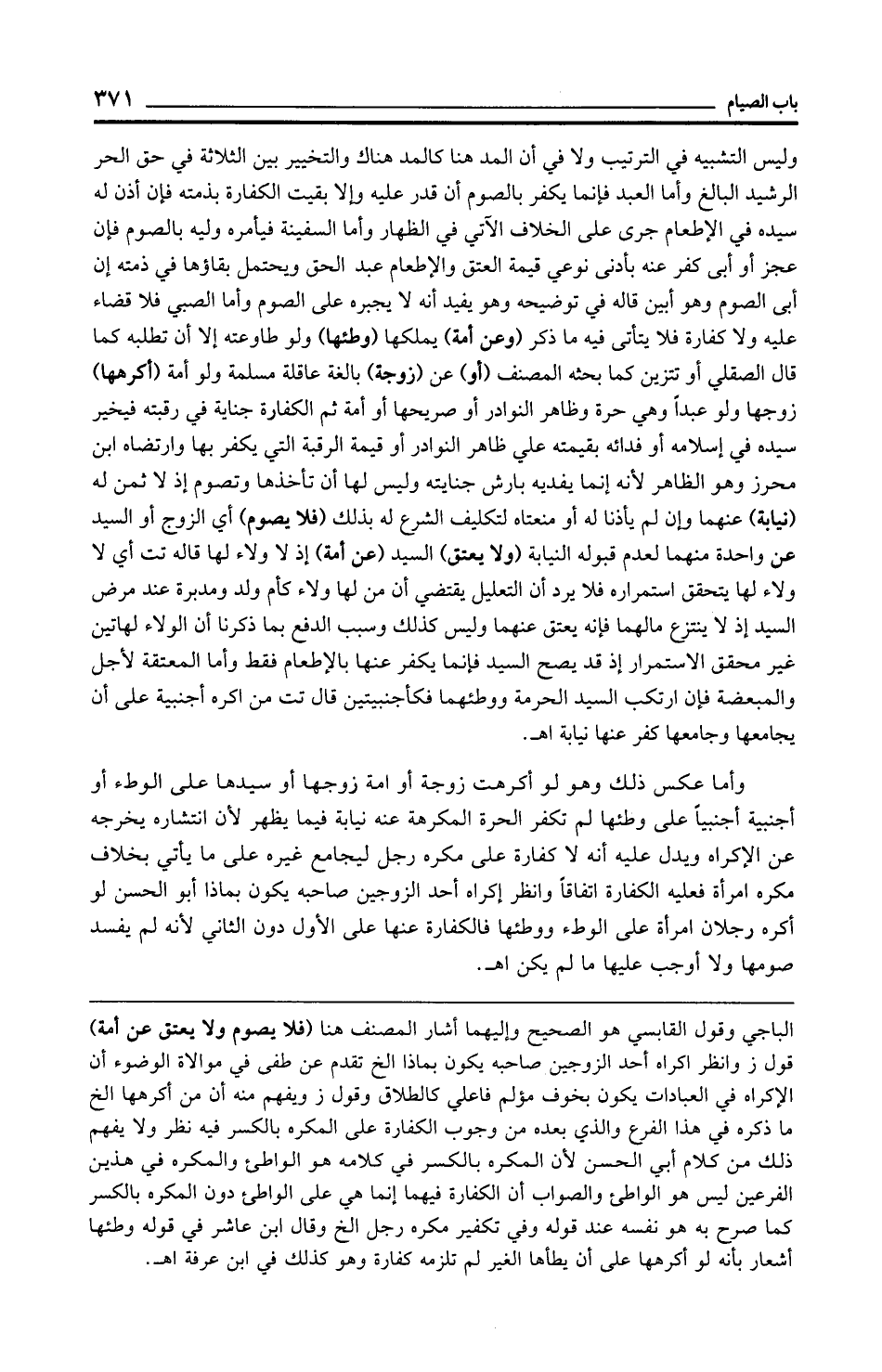 الباجي وقول القابسي هو الصحيح وإليهما أشار المصنف هنا (فلا يصوم ولا يعتق عن أمة) قول ز وانظر إكراه أحد الزوجين صاحبه يكون بماذا الخ تقدم عن طفى في موالاة الوضوء أن الإكراه في العبادات يكون بخوف مؤلم فاعلي كالطلاق وقول ز ويفهم منه أن من أكرهها الخ ما ذكره في هذا الفرع والذي بعده من وجوب الكفارة على المكره بالكسر فيه نظر ولا يفهم ذلك من كلام أبي الحسن لأن المكره بالكسر في كلامه هو الواطىء والمكره في هذين الفرعين ليس هو الواطىء والصواب أن الكفارة فيهما إنما هي على الواطىء دون المكره بالكسر كما صرح به هو نفسه عند قوله وفي تكفير مكره رجل الخ وقال ابن عاشر في قوله وطئها أشعار بأنه لو أكرهها على أن يطأها الغير لم تلزمه كفارة وهو كذلك في ابن عرفة اهـ.