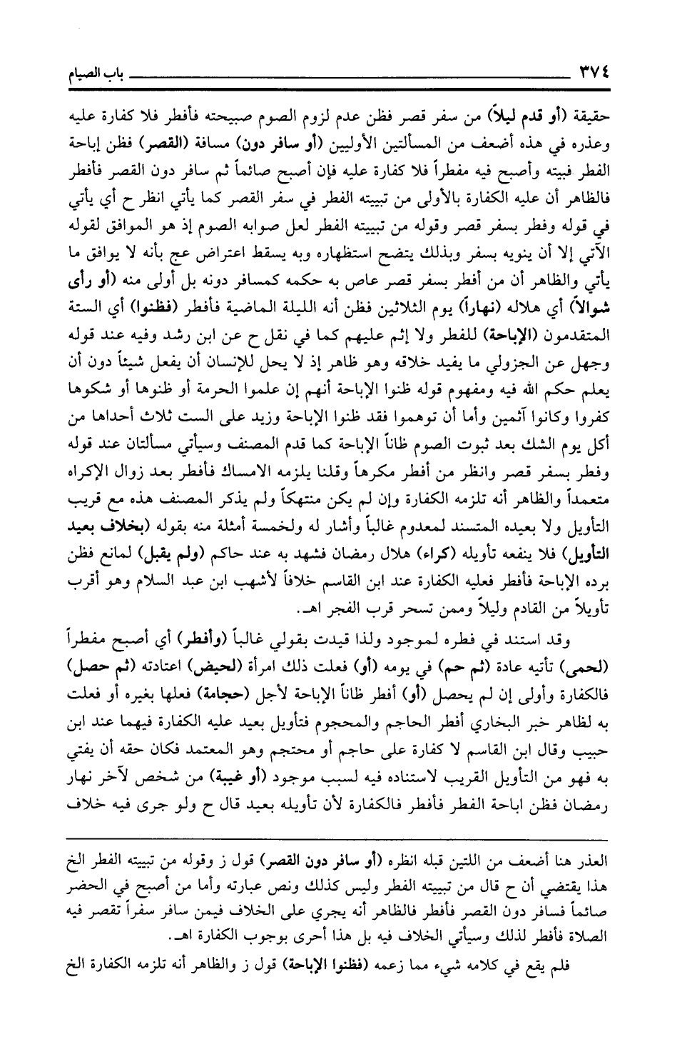 حقيقة (أو قدم ليلًا) من سفر قصر فظن عدم لزوم الصوم صبيحته فأفطر فلا كفارة عليه وعذره في هذه أضعف من المسألتين الأوليين (أو سافر دون) مسافة (القصر) فظن إباحة الفطر فبيته وأصبح فيه مفطرًا فلا كفارة عليه فإن أصبح صائمًا ثم سافر دون القصر فأفطر فالظاهر أن عليه الكفارة بالأولى من تبييته الفطر في سفر القصر كما يأتي انظر ح أي يأتي في قوله وفطر بسفر قصر وقوله من تبييته الفطر لعل صوابه الصوم إذ هو الموافق لقوله الآتي إلا أن ينويه بسفر وبذلك يتضح استظهاره وبه يسقط اعتراض عج بأنه لا يوافق ما يأتي والظاهر أن من أفطر بسفر قصر عاص به حكمه كمسافر دونه بل أولى منه (أو رأى شوالًا) أي هلاله (نهارًا) يوم الثلاثين فظن أنه الليلة الماضية فأفطر (فظنوا) أي الستة المتقدمون (الإباحة) للفطر ولا إثم عليهم كما في نقل ح عن ابن رشد وفيه عند قوله وجهل عن الجزولي ما يفيد خلافه وهو ظاهر إذ لا يحل للإنسان أن يفعل شيئًا دون أن يعلم حكم الله فيه ومفهوم قوله ظنوا الإباحة أنهم إن علموا الحرمة أو ظنوها أو شكوها كفروا وكانوا آثمين وأما أن توهموا فقد ظنوا الإباحة وزيد على الست ثلاث أحداها من أكل يوم الشك بعد ثبوت الصوم ظانًّا الإباحة كما قدم المصنف وسيأتي مسألتان عند قوله وفطر بسفر قصر وانظر من أفطر مكرهًا وقلنا يلزمه الامساك فأفطر بعد زوال الإكراه متعمدًا والظاهر أنه تلزمه الكفارة وإن لم يكن منتهكًا ولم يذكر المصنف هذه مع قريب التأويل ولا بعيده المتسند لمعدوم غالبًا وأشار له ولخمسة أمثلة منه بقوله (بخلاف بعيد التأويل) فلا ينفعه تأويله (كراء) هلال رمضان فشهد به عند حاكم (ولم يقبل) لمانع فظن برده الإباحة فأفطر فعليه الكفارة عند ابن القاسم خلافًا لأشهب ابن عبد السلام وهو أقرب تأويلًا من القادم وليلًا وممن تسحر قرب الفجر اهـ.