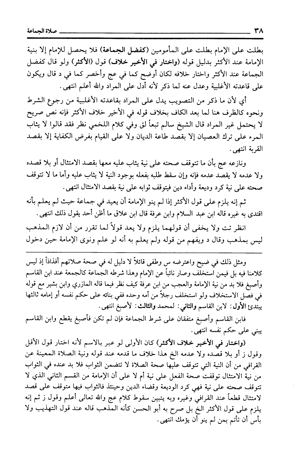 ومثل ذلك في ضيح واعترضه س وطفى قائلًا لا دليل له في صحة صلاتهم أفذاذًا إذ ليس كلامنا فيه بل فيمن استخلف وصار نائبًا عن الإمام وهذا شرطه الجماعة كالجمعة عند ابن القاسم وأصبغ فلا بد من نية الإمامة والعجب من ابن عرفة كيف نظر فيما قاله المازري وابن بشير مع قوله في فصل الاستخلاف ولو استخلف رجلًا من أمه وحده ففي بنائه على حكم نفسه أو إمامه ثالثها يبتديء الأول: لابن القاسم والثاني: لمحمد والثالث: لأصبغ انتهى.