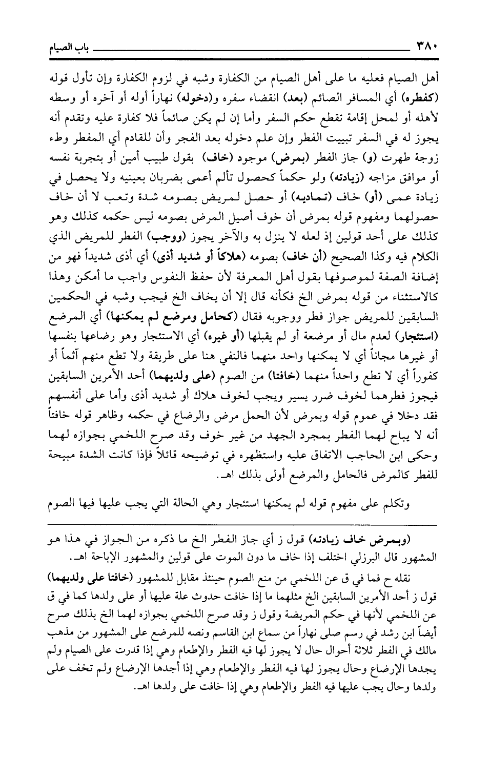 أهل الصيام فعليه ما على أهل الصيام من الكفارة وشبه في لزوم الكفارة وإن تأول قوله (كفطره) أي المسافر الصائم (بعد) انقضاء سفره و (دخوله) نهارًا أوله أو آخره أو وسطه لأهله أو لمحل إقامة تقطع حكم السفر وأما إن لم يكن صائمًا فلا كفارة عليه وتقدم أنه يجوز له في السفر تبييت الفطر وإن علم دخوله بعد الفجر وأن للقادم أي المفطر وطء زوجة طهرت (و) جاز الفطر (بمرض) موجود (خاف) بقول طبيب أمين أو بتجربة نفسه أو موافق مزاجه (زيادته) ولو حكمًا كحصول تألم أعمى بضربان بعينيه ولا يحصل في زيادة عمى (أو) خاف (تماديه) أو حصل لمريض بصومه شدة وتعب لا أن خاف حصولهما ومفهوم قوله بمرض أن خوف أصيل المرض بصومه ليس حكمه كذلك وهو كذلك على أحد قولين إذ لعله لا ينزل به والآخر يجوز (ووجب) الفطر للمريض الذي الكلام فيه وكذا الصحيح (أن خاف) بصومه (هلاكًا أو شديد أذى) أي أذى شديدًا فهو من إضافة الصفة لموصوفها بقول أهل المعرفة لأن حفظ النفوس واجب ما أمكن وهذا كالاستثناء من قوله بمرض الخ فكأنه قال إلا أن يخاف الخ فيجب وشبه في الحكمين السابقين للمريض جواز فطر ووجوبه فقال (كحامل ومرضع لم يمكنها) أي المرضع (استئجار) لعدم مال أو مرضعة أو لم يقبلها (أو غيره) أي الاستئجار وهو رضاعها بنفسها أو غيرها مجانًا أي لا يمكنها واحد منهما فالنفي هنا على طريقة ولا تطع منهم آثمًا أو كفورًا أي لا تطع واحدًا منهما (خافتا) من الصوم (على ولديهما) أحد الأمرين السابقين فيجوز فطرهما لخوف ضرر يسير ويجب لخوف هلاك أو شديد أذى وأما على أنفسهم فقد دخلا في عموم قوله وبمرض لأن الحمل مرض والرضاع في حكمه وظاهر قوله خافتًا أنه لا يباح لهما الفطر بمجرد الجهد من غير خوف وقد صرح اللخمي بجوازه لهما وحكى ابن الحاجب الاتفاق عليه واستظهره في توضيحه قائلًا فإذا كانت الشدة مبيحة للفطر كالمرض فالحامل والمرضع أولى بذلك اهـ.