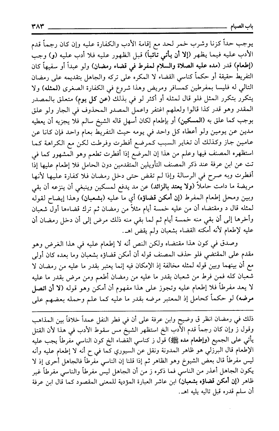 ذلك في رمضان انظر ق وضيح وابن عرفة على أن في فطر النفل عمدًا خلاف أبي بين المذاهب وقول ز وإن كان رجمًا قدم الأدب الخ استظهر الشيخ مس سقوط الأدب في هذا لأن القتل يأتي على الجميع (وإطعام مده - صلى الله عليه وسلم -) قول ز كناسي القضاء الخ كون الناسي مفرطًا يجب عليه الإطعام قال البرزلي هو ظاهر المدونة ونقل عن السيوري كما في ح أنه لا إطعام عليه وأنه ليس مفرطًا قال بعض الشيوخ وهو الظاهر ثم إذا قلنا إن الناسي مفرطًا فالجاهل أحرى إذ لا يكون الجاهل أعذر من الناسي فما ذكره ز من أن الجاهل ليس مفرطًا والناسي مفرطًا غير ظاهر (إن أمكن قضاؤه بشعبان) ابن عاشر العبارة المؤدية للمعنى المقصود كما قال ابن عرفة أن سلم قدره قبل تاليه يليه اهـ.