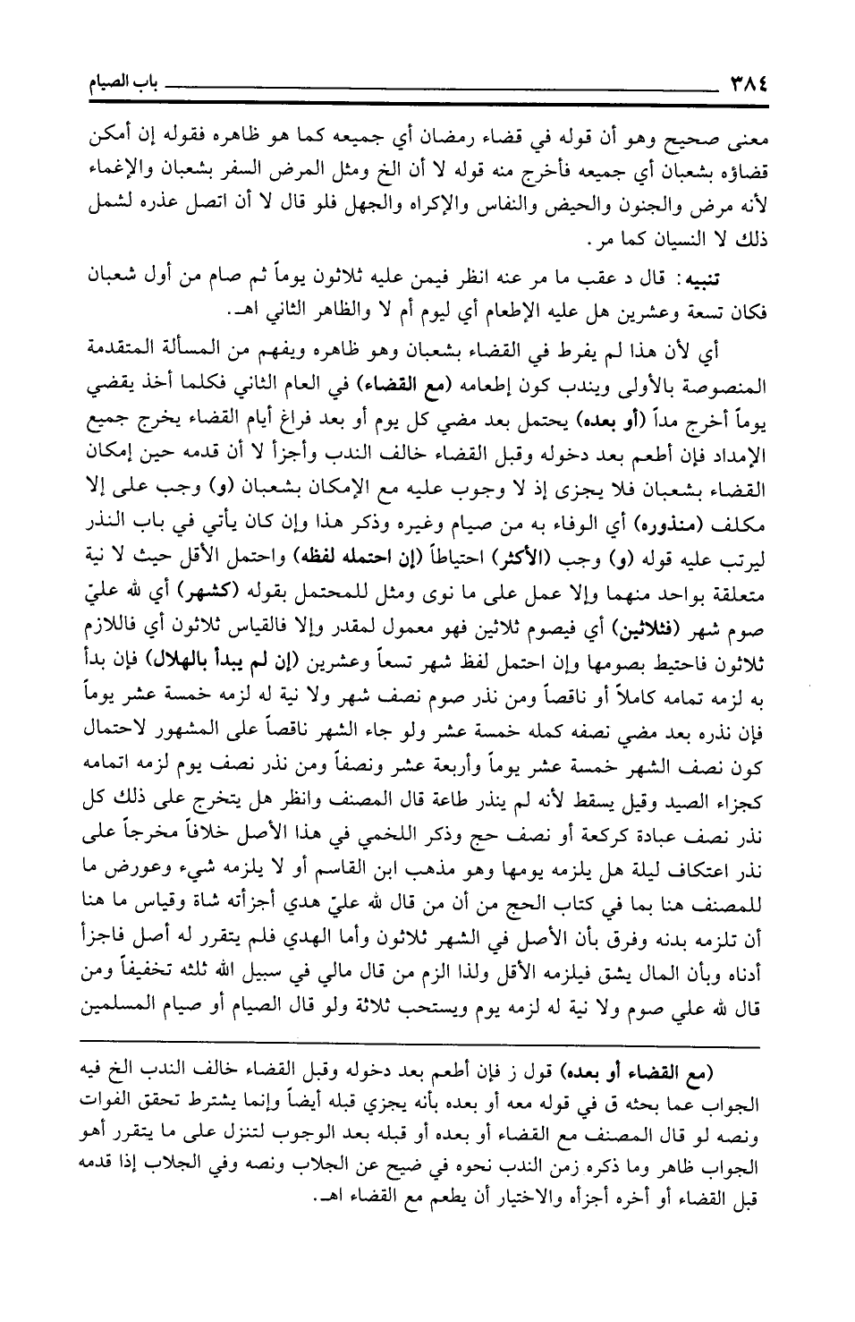 تنبيه: قال د عقب ما مر عنه انظر فيمن عليه ثلاثون يومًا ثم صام من أول شعبان فكان تسعة وعشرين هل عليه الإطعام أي ليوم أم لا والظاهر الثاني اهـ.