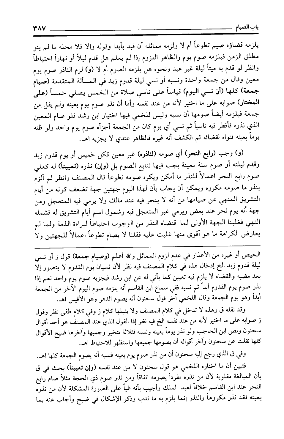 (و) وجب (رابع النحر) أي صومه (لناذره) غير معين ككل خميس أو يوم قدوم زيد وقدم ليلته أو صوم سنة معينة يجب فيها تتابع الصوم بل (وإن) نذره (تعيينًا) له كعلي صوم رابع النحر إعمالًا للنذر ما أمكن ويكره صومه تطوعًا قال المصنف وانظر لم ألزم بنذر ما صومه مكروه ويمكن أن يجاب بأن لهذا اليوم جهتين جهة تضعف كونه من أيام التشريق المنهي عن صيامها من أنه لا ينحر فيه عند مالك ولا يرمي فيه المتعجل ومن جهة أنه يوم نحر عند بعض ويرمي غير المتعجل فيه وشمول اسم أيام التشريق له فشمله النهي فغلبنا الجهة الأولى لما اقتضاه النذر من الوجوب احتياطًا لبراءة الذمة ولما لم يعارض الكراهة ما هو أقوى منها غلبت عليه فقلنا لا يصام تطوعًا إعمالًا للجهتين ولا