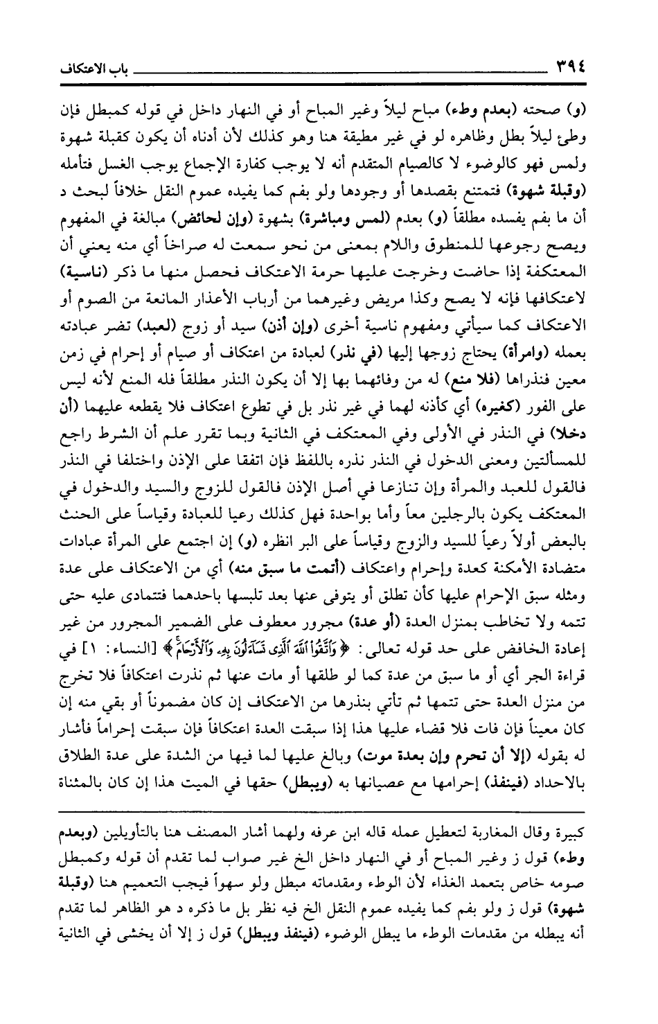 (و) صحته (بعدم وطء) مباح ليلًا وغير المباح أو في النهار داخل في قوله كمبطل فإن وطئ ليلًا بطل وظاهره لو في غير مطيقة هنا وهو كذلك لأن أدناه أن يكون كقبلة شهوة ولمس فهو كالوضوء لا كالصيام المتقدم أنه لا يوجب كفارة الإجماع يوجب الغسل فتأمله (وقبلة شهوة) فتمتنع بقصدها أو وجودها ولو بفم كما يفيده عموم النقل خلافًا لبحث د أن ما بفم يفسده مطلقًا (و) بعدم (لمس ومباشرة) بشهوة (وإن لحائض) مبالغة في المفهوم ويصح رجوعها للمنطوق واللام بمعنى من نحو سمعت له صراخًا أي منه يعني أن المعتكفة إذا حاضت وخرجت عليها حرمة الاعتكاف فحصل منها ما ذكر (ناسية) لاعتكافها فإنه لا يصح وكذا مريض وغيرهما من أرباب الأعذار المانعة من الصوم أو الاعتكاف كما سيأتي ومفهوم ناسية أخرى (وإن أذن) سيد أو زوج (لعبد) تضر عبادته بعمله (وامرأة) يحتاج زوجها إليها (في نذر) لعبادة من اعتكاف أو صيام أو إحرام في زمن معين فنذراها (فلا منع) له من وفائهما بها إلا أن يكون النذر مطلقًا فله المنع لأنه ليس على الفور (كغيره) أي كأذنه لهما في غير نذر بل في تطوع اعتكاف فلا يقطعه عليهما (أن دخلا) في النذر في الأولى وفي المعتكف في الثانية وبما تقرر علم أن الشرط راجع للمسألتين ومعنى الدخول في النذر نذره باللفظ فإن اتفقا على الإذن واختلفا في النذر فالقول للعبد والمرأة وإن تنازعا في أصل الإذن فالقول للزوج والسيد والدخول في المعتكف يكون بالرجلين معًا وأما بواحدة فهل كذلك رعيا للعبادة وقياسًا على الحنث بالبعض أولًا رعيًا للسيد والزوج وقياسًا على البر انظره (و) إن اجتمع على المرأة عبادات متضادة الأمكنة كعدة وإحرام واعتكاف (أتمت ما سبق منه) أي من الاعتكاف على عدة ومثله سبق الإحرام عليها كأن تطلق أو يتوفى عنها بعد تلبسها بأحدهما فتتمادى عليه حتى تتمه ولا تخاطب بمنزل العدة (أو عدة) مجرور معطوف على الضمير المجرور من غير إعادة الخافض على حد قوله تعالى: {وَاتَّقُوا اللَّهَ الَّذِي تَسَاءَلُونَ بِهِ وَالْأَرْحَامَ} [النساء: 1] في قراءة الجر أي أو ما سبق من عدة كما لو طلقها أو مات عنها ثم نذرت اعتكافًا فلا تخرج من منزل العدة حتى تتمها ثم تأتي بنذرها من الاعتكاف إن كان مضمونًا أو بقي منه إن كان معينًا فإن فات فلا قضاء عليها هذا إذا سبقت العدة اعتكافًا فإن سبقت إحرامًا فأشار له بقوله (إلا أن تحرم وإن بعدة موت) وبالغ عليها لما فيها من الشدة على عدة الطلاق بالإحداد (فينفذ) إحرامها مع عصيانها به (ويبطل) حقها في الميت هذا إن كان بالمثناة