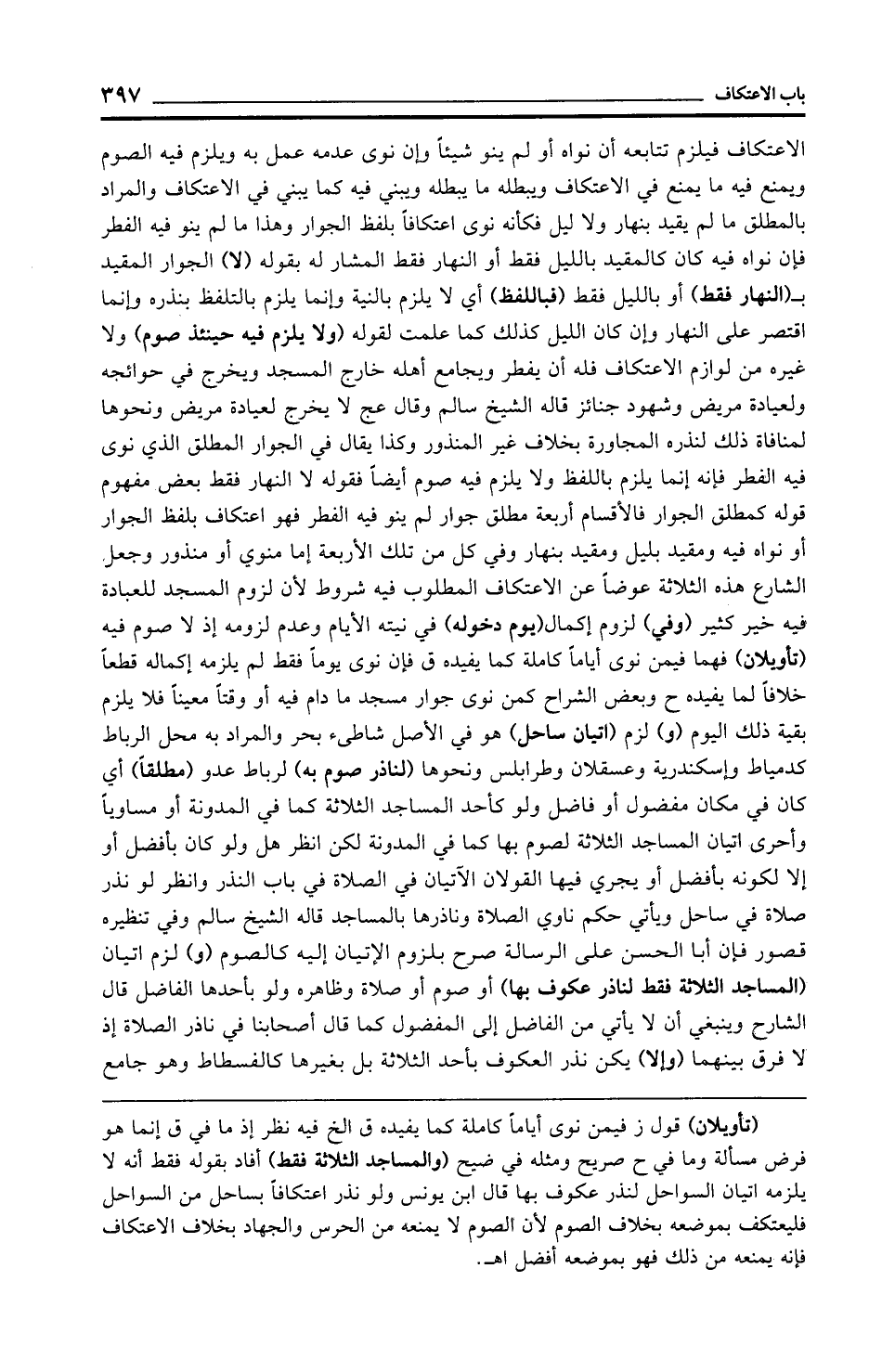 الاعتكاف فيلزم تتابعه أن نواه أو لم ينو شيئًا وإن نوى عدمه عمل به ويلزم فيه الصوم ويمنع فيه ما يمنع في الاعتكاف ويبطله ما يبطله ويبني فيه كما يبني في الاعتكاف والمراد بالمطلق ما لم يقيد بنهار ولا ليل فكأنه نوى اعتكافًا بلفظ الجوار وهذا ما لم ينو فيه الفطر فإن نواه فيه كان كالمقيد بالليل فقط أو النهار فقط المشار له بقوله (لا) الجوار المقيد بـ (النهار فقط) أو بالليل فقط (فباللفظ) أي لا يلزم بالنية وإنما يلزم بالتلفظ بنذره وإنما اقتصر على النهار وإن كان الليل كذلك كما علمت لقوله (ولا يلزم فيه حينئذ صوم) ولا غيره من لوازم الاعتكاف فله أن يفطر ويجامع أهله خارج المسجد ويخرج في حوائجه ولعيادة مريض وشهود جنائز قاله الشيخ سالم وقال عج لا يخرج لعيادة مريض ونحوها لمنافاة ذلك لنذره المجاورة بخلاف غير المنذور وكذا يقال في الجوار المطلق الذي نوى فيه الفطر فإنه إنما يلزم باللفظ ولا يلزم فيه صوم أيضًا فقوله لا النهار فقط بعض مفهوم قوله كمطلق الجوار فالأقسام أربعة مطلق جوار لم ينو فيه الفطر فهو اعتكاف بلفظ الجوار أو نواه فيه ومقيد بليل ومقيد بنهار وفي كل من تلك الأربعة إما منوي أو منذور وجعل الشارع هذه الثلاثة عوضًا عن الاعتكاف المطلوب فيه شروط لأن لزوم المسجد للعبادة فيه خير كثير (وفي) لزوم إكمال (يوم دخوله) في نيته الأيام وعدم لزومه إذ لا صوم فيه (تأويلان) فهما فيمن نوى أيامًا كاملة كما يفيده ق فإن نوى يومًا فقط لم يلزمه إكماله قطعًا خلافًا لما يفيده ح وبعض الشراح كمن نوى جوار مسجد ما دام فيه أو وقتًا معينًا فلا يلزم بقية ذلك اليوم (و) لزم (إتيان ساحل) هو في الأصل شاطئ بحر والمراد به محل الرباط كدمياط وإسكندرية وعسقلان وطرابلس ونحوها (لناذر صوم به) لرباط عدو (مطلقًا) أي كان في مكان مفضول أو فاضل ولو كأحد المساجد الثلاثة كما في المدونة أو مساويًا وأحرى إتيان المساجد الثلاثة لصوم بها كما في المدونة لكن انظر هل ولو كان بأفضل أو إلا لكونه بأفضل أو يجري فيها القولان الإتيان في الصلاة في باب النذر وانظر لو نذر صلاة في ساحل ويأتي حكم ناوي الصلاة وناذرها بالمساجد قاله الشيخ سالم وفي تنظيره قصور فإن أبا الحسن على الرسالة صرح بلزوم الإتيان إليه كالصوم (و) لزم إتيان (المساجد الثلاثة فقط لناذر عكوف بها) أو صوم أو صلاة وظاهره ولو بأحدها الفاضل قال الشارح وينبغي أن لا يأتي من الفاضل إلى المفضول كما قال أصحابنا في ناذر الصلاة إذ لا فرق بينهما (و (لا) يكن نذر العكوف بأحد الثلاثة بل بغيرها كالفسطاط وهو جامع